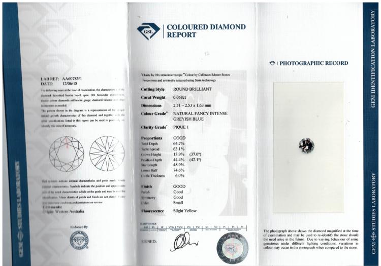 0.068ct Argyle Intense Greyish Blue GSL