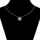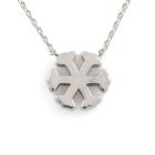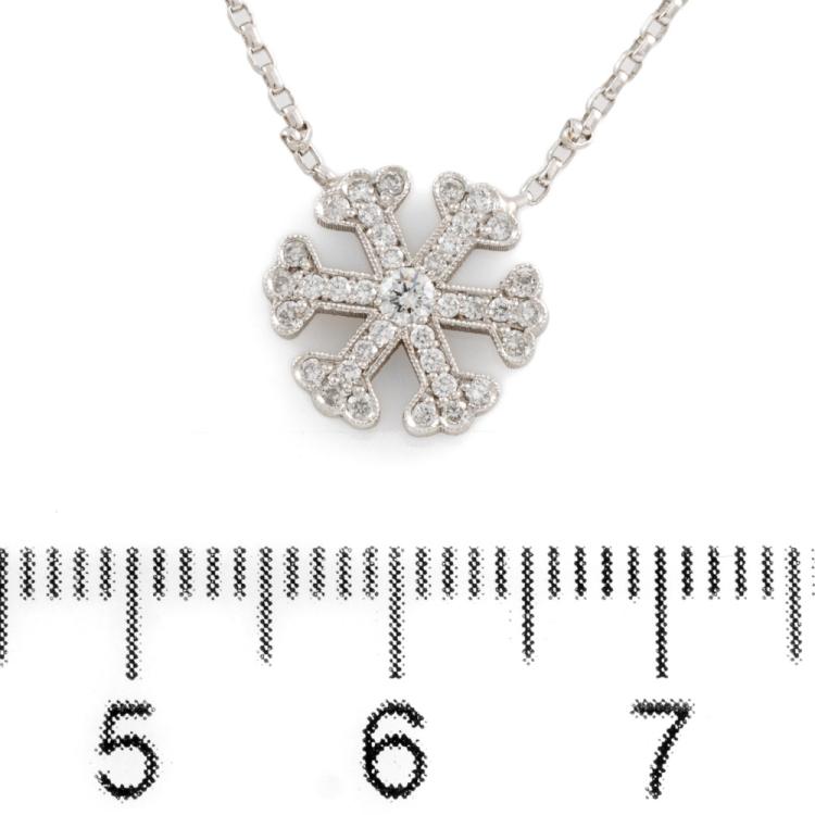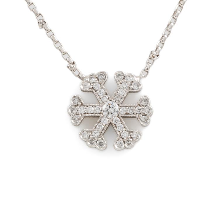 Snowflake design pendant with round Natural Diamonds totalling 0.20cts. Size 11mm. 18ct white gold with attached 18ct white gold adjustable chain. Length: 50cm. Weight: 3.7g. (As new)