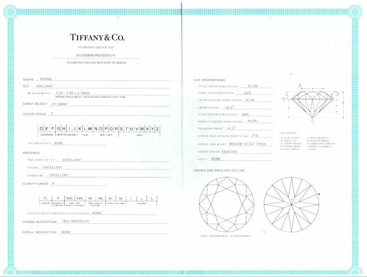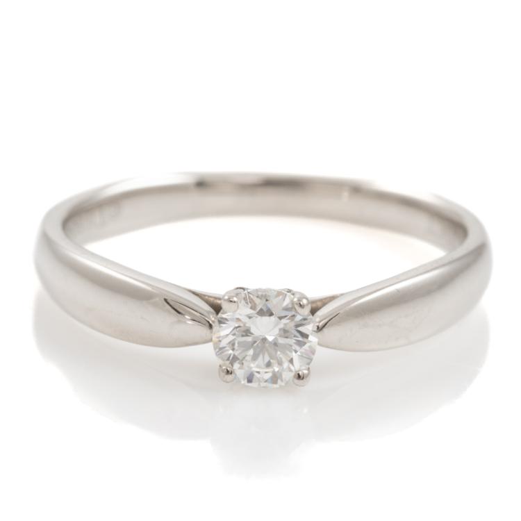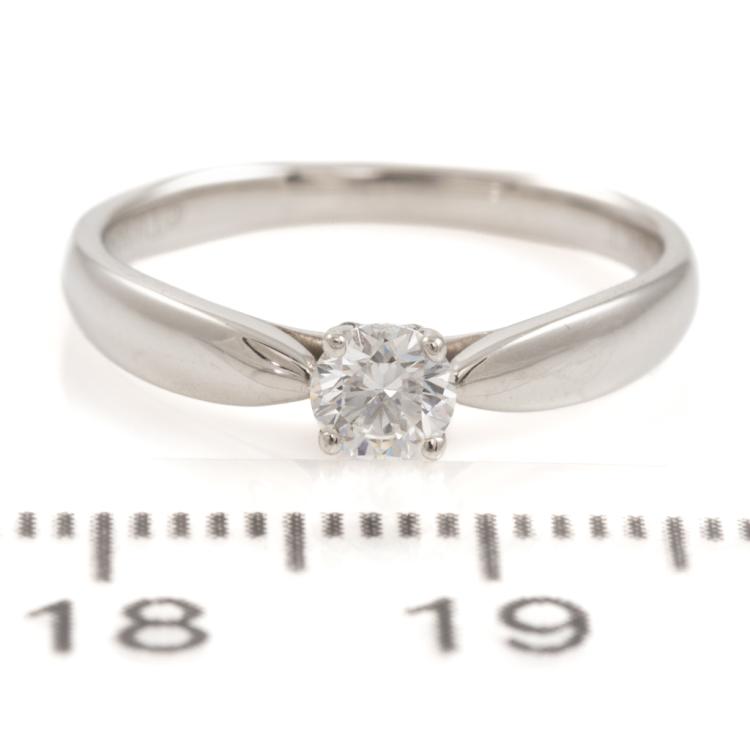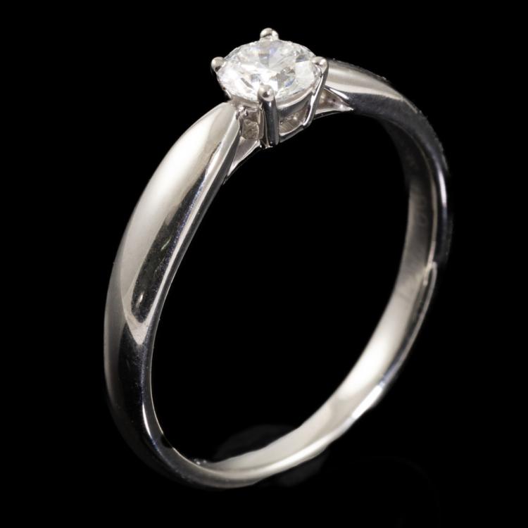 Tiffany & Co Harmony Diamond Solitaire ring with a brilliant round cut Natural Diamond of 0.21ct (Tiffany Certificate graded as E IF). Platinum - 950. Ring size H - ring resizing is not recommended. Weight: 2.6g. Tiffany & Co box and Tiffany Diamond Certificate. (Pre-owned)