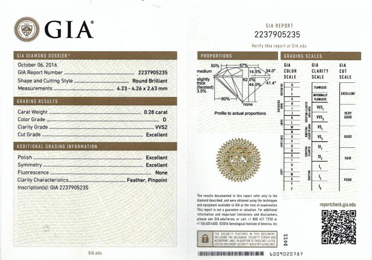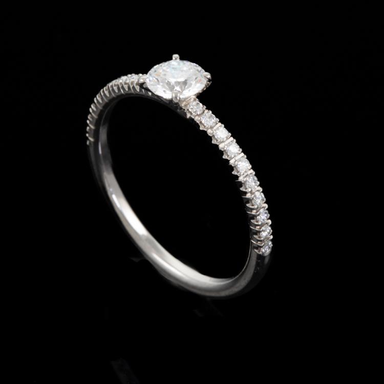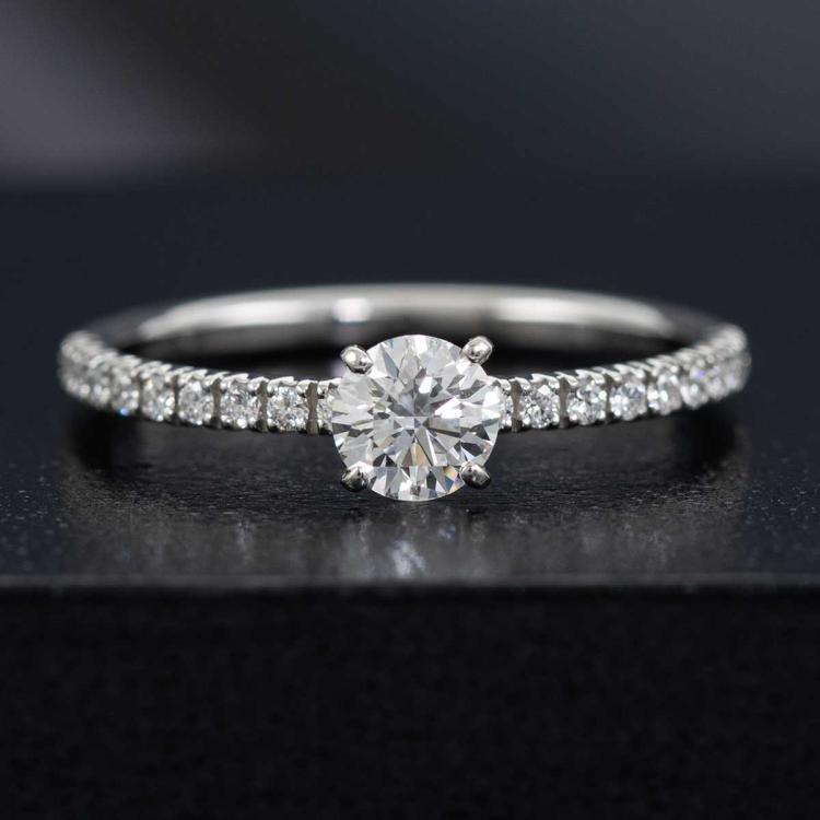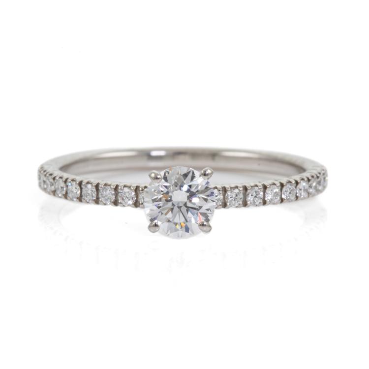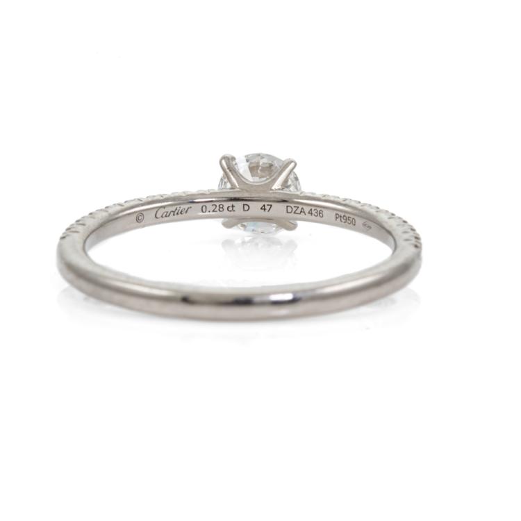 Etincelle De Cartier Diamond Solitaire ring with round Natural Diamond of 0.28cts (with GIA Report graded as D VVS2 #22379055235) and surrounding round Diamonds totalling approximately 0.18cts. Platinum 950. Stamped size 47, H- ring resizing is not recommended. Weight: 1.7g. With Cartier Certificate dated 13/03/2019 and Cartier box. (Pre-owned)