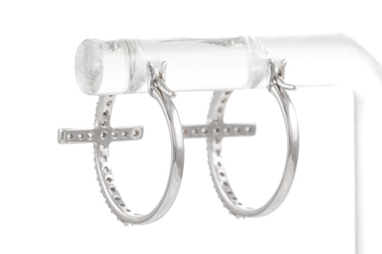 Diamond hoop Cross earrings with 38 round Natural Diamonds totalling 0.36cts (Estimated grading: H-I SI). 14ct white gold. Width: 16.0mm. Length: 18.0mm. Weight: 2g. (New).