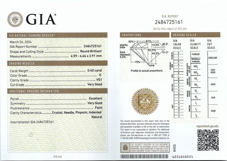 A loose round brilliant cut Natural Diamond of 0.40ct (with GIA summary report graded as D VS1#2484725161). (New)