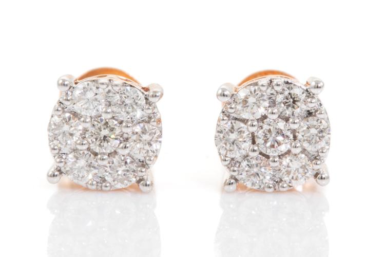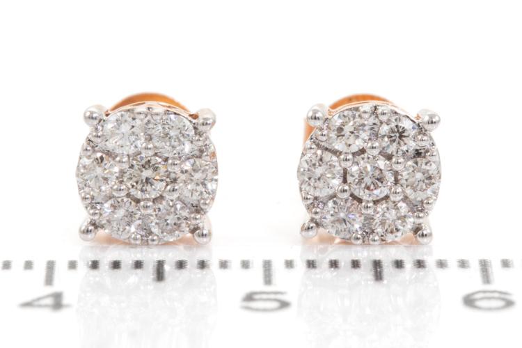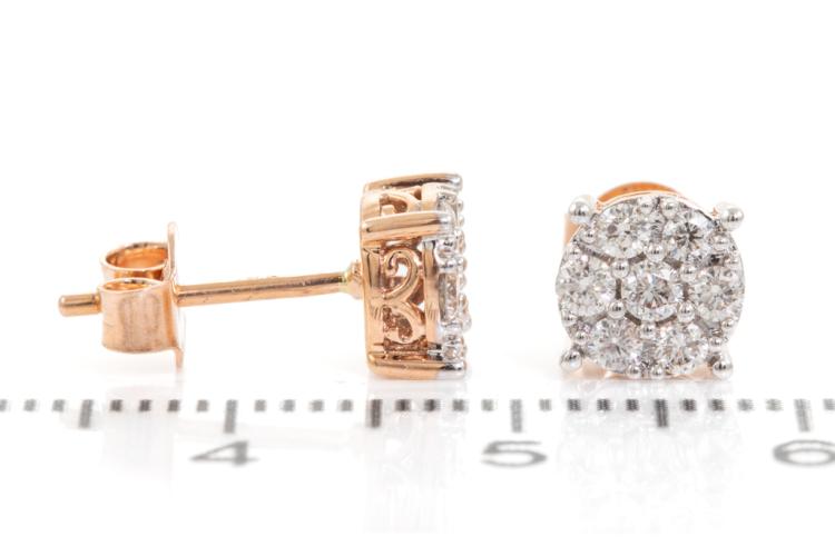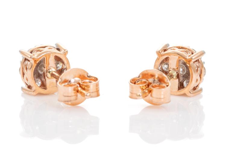 Diamond earrings with 14 round diamonds totalling 0.47cts. (Estimated grading: H-I SI). 14ct rose gold with white gold tips. Weight: 1.8g. (New)