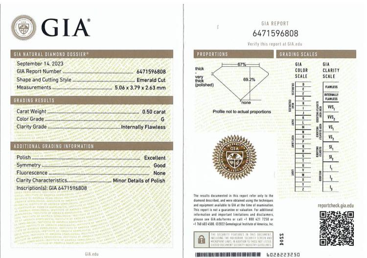 A loose emerald cut Natural Diamond of 0.50ct (with GIA summary report graded as G Internally Flawless # 6471596808