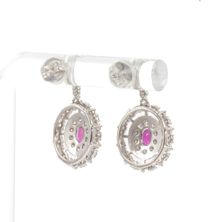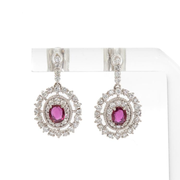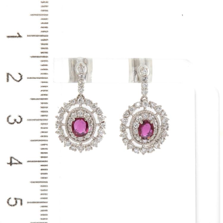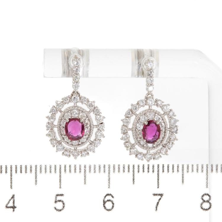 Ruby and Diamond dangle earrings with 2 oval shape Natural Rubies totalling 0.51cts and round Natural Diamonds totalling 0.88cts (Estimated grading: G SI-P1). Platinum 950 with 18ct white gold and silicon backs. Weight: 4.0g. (Pre-owned)