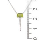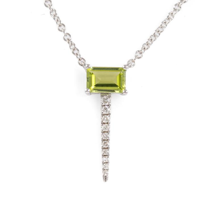 Peridot and Diamond pendant with emerald cut Natural Peridot of 0.59ct and round Natural Diamonds totalling 0.08cts. 14ct white gold attached with 14ct white gold adjustable chain. Length: 46cm. Weight: 2.5g. (New)