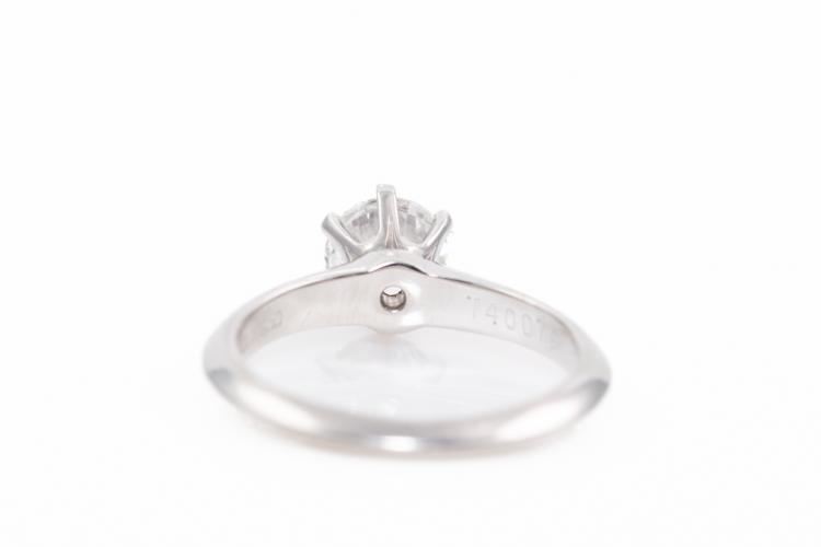 Tiffany & Co. Solitaire ring with round brilliant cut Natural Diamond 0.65ct (with Tiffany & Co. certificate graded as E VVS1). Platinum 950. Ring size G - ring resizing is not recommended. Weight: 3.5g. With Tiffany & Co. Certificate and Box. (Pre-owned)