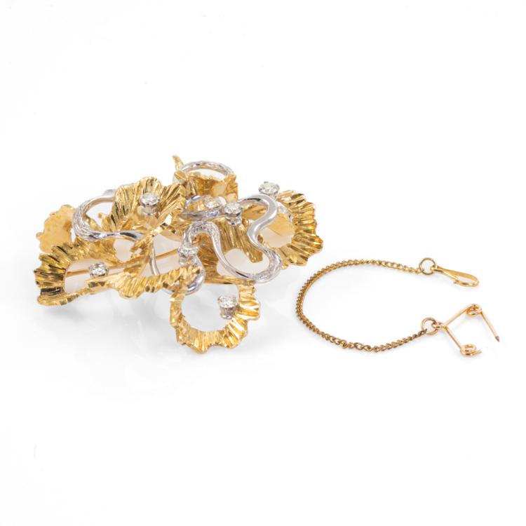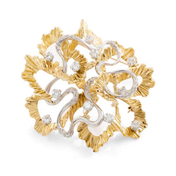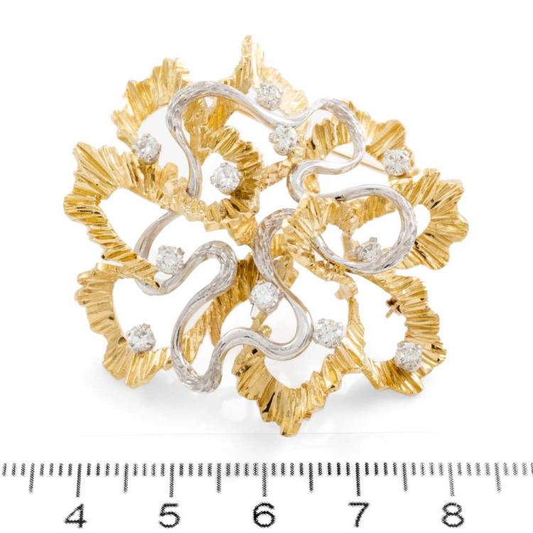 Diamond Brooch with 11 round Natural Diamonds totalling approximately 1.10cts (Estimated grading: H-I SI). 15ct Yellow & white gold - XRF tested, stamped 18ct. Weight: 22.2g. Note - safety chain attached to the pin is broken. (Pre-owned)