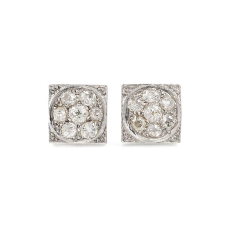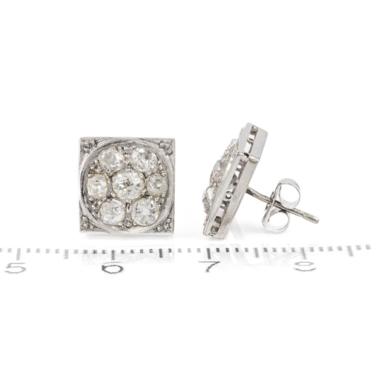 Diamond dress earrings with Old European Cut Natural Diamonds totalling approximately 0.84cts (Estimated grading: J-K SI-P1). 18ct white gold. Size: 10.5mm x 10.5mm. Weight: 3.0g. (Pre-owned)