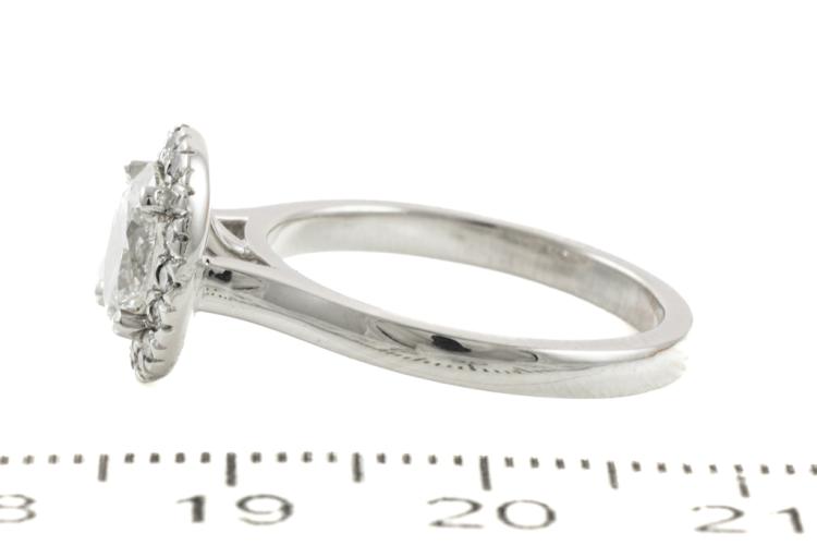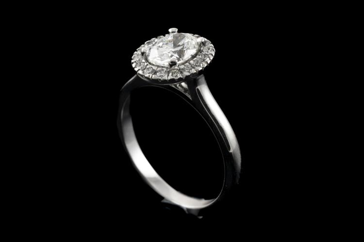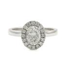 Diamond halo ring with oval shape Natural Diamond of 0.90ct (With GIA summary report graded as E SI1 #2225927090) and surrounding round Natural Diamonds totalling 0.18cts (Estimated grading: G-H VS-SI). 18 white gold ring. Ring size K 3/4. Weight: 4.8g (New)