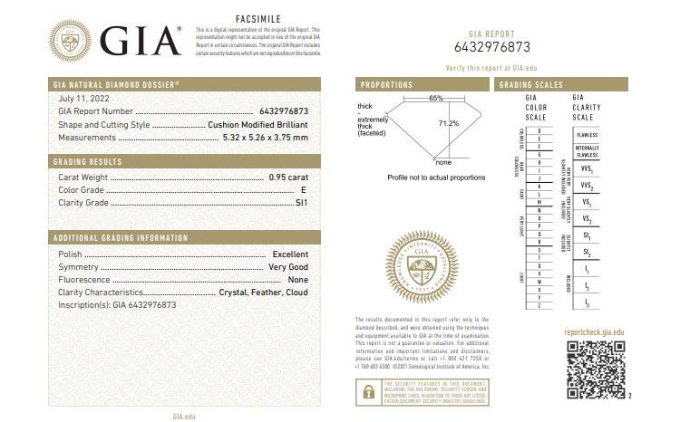A loose cushion cut Natural Diamond of 0.95ct (with GIA summary report graded as E SI1 #6432976873). (New)