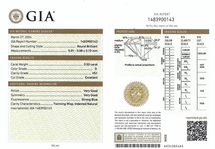 Diamond stud earrings with 2 round brilliant cut natural Diamonds totalling 1.00ct (both with GIA Summary Reports both graded as D VS1 & D VS2 # 1483900143,