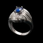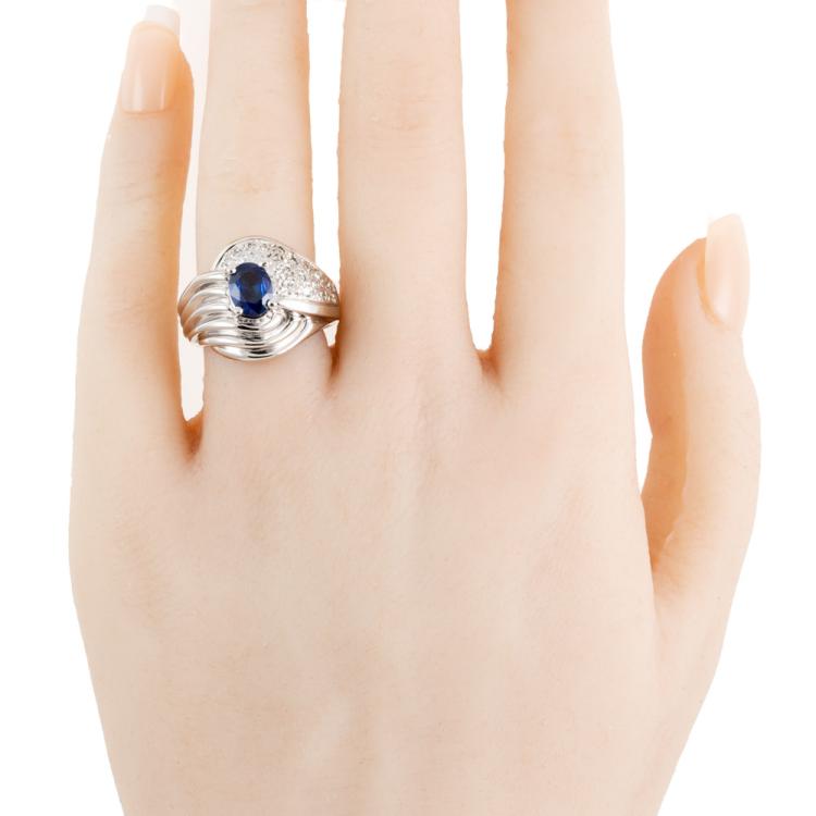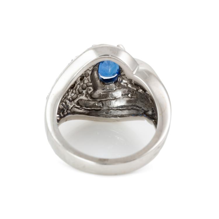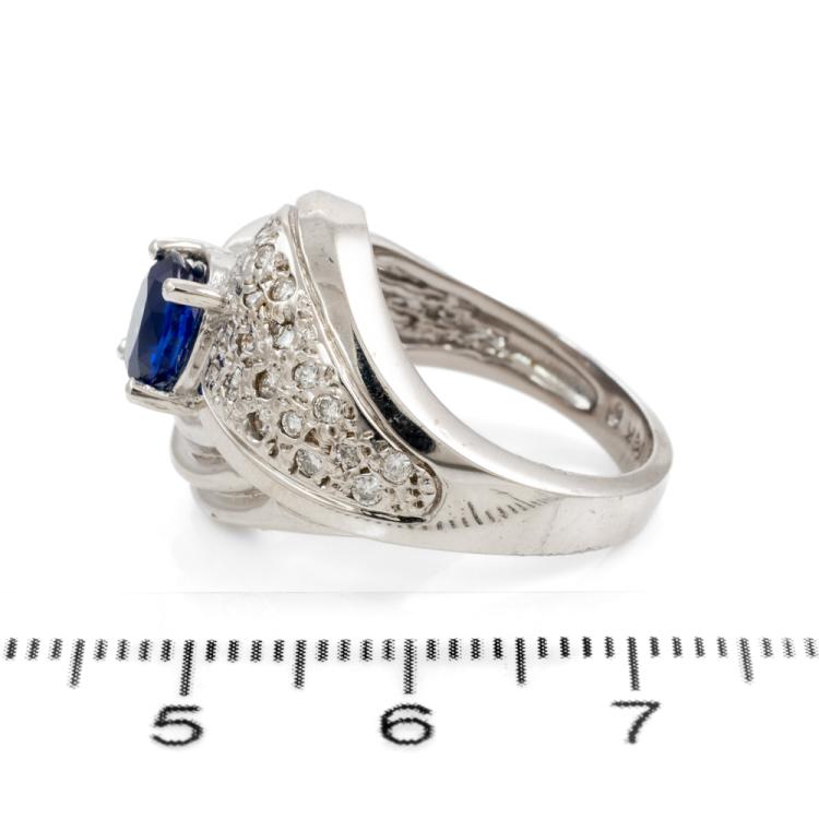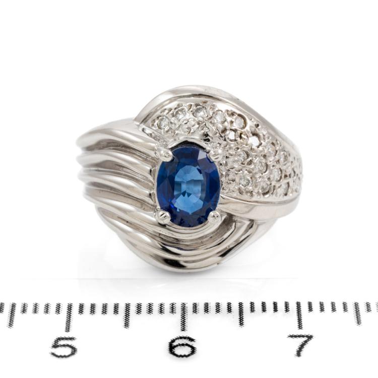 Sapphire and Diamond ring with oval shape Blue Natural Sapphire of 1.00ct and Natural Diamonds totalling 0.30cts (Estimated grading: G-H SI). 14ct White gold. Ring size M. Weight 9.3g. (As New)^