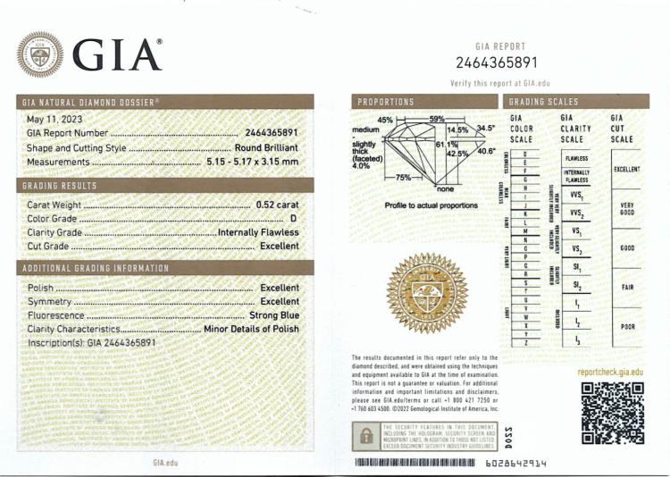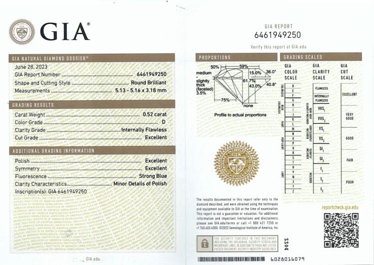 Diamond stud earrings with 2 round brilliant cut Natural Diamonds totalling 1.04cts (both with GIA summary reports graded as D Internally Flawless #2464365891, 6461949250). 18ct white gold. Weight: 1.1g (New)