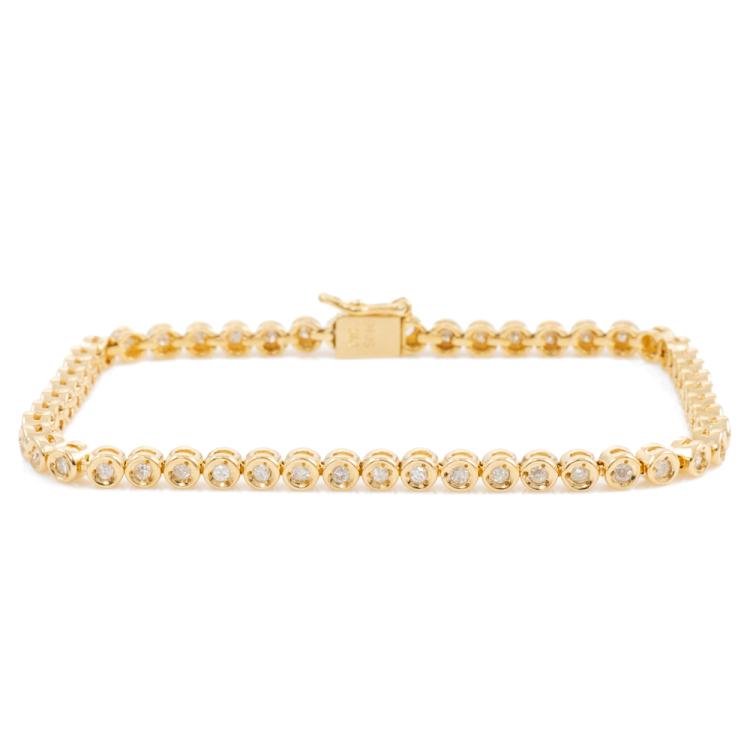 Diamond tennis bracelet with 42 round natural Diamonds totalling 1.05cts (Estimated grading: I-J SI-P1). 18ct yellow gold. Length: 18cm. Weight: 10.9g. (Pre-owned)