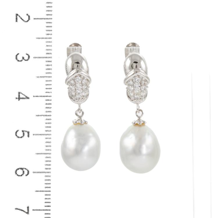 Pearl and Diamond clip-on screwback (no posts) drop earrings with South Sea Pearls of 10.5mm and round Natural Diamonds totalling 0.40cts (Estimated grading: H SI-P1). 18ct white gold. Weight: 8.2g. (Pre-owned)