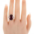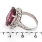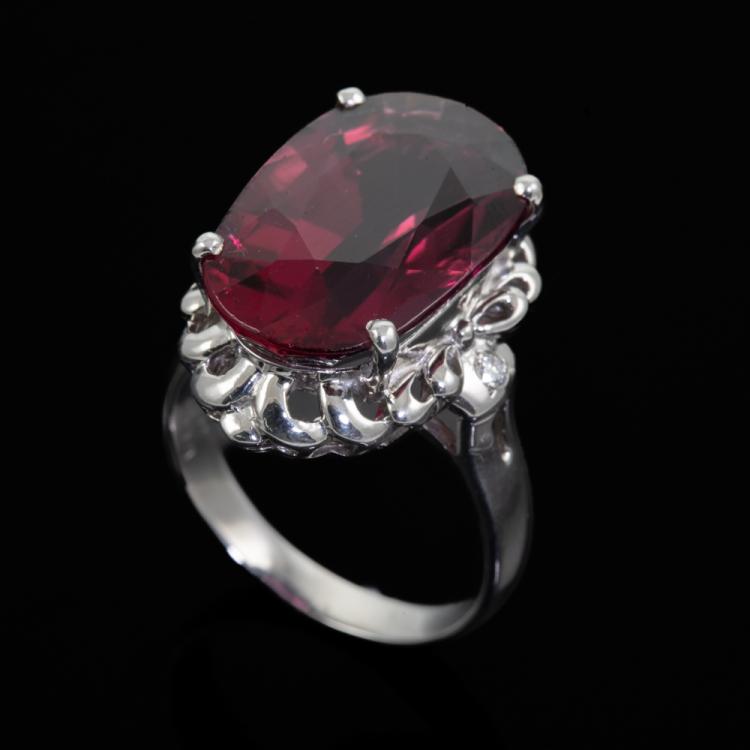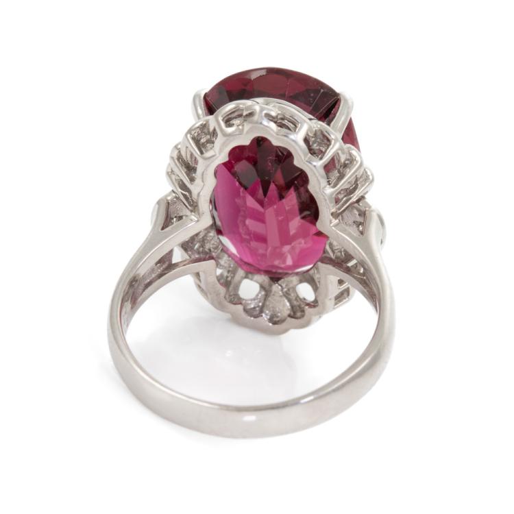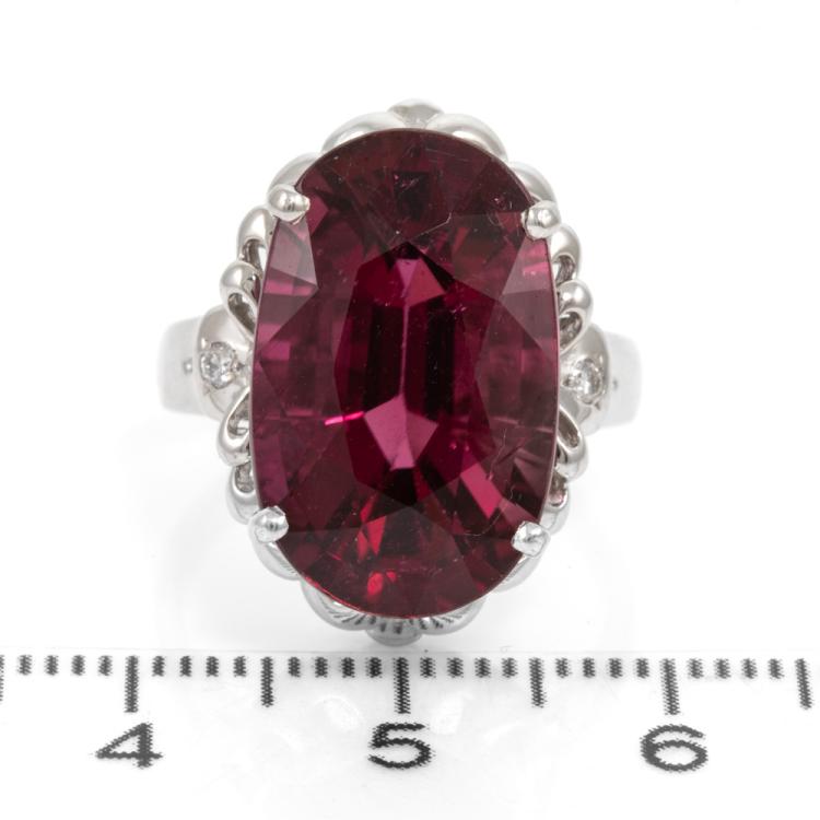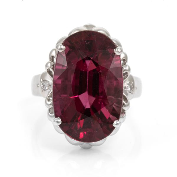 Rubellite and Diamond ring with oval Natural Rubellite Tourmaline of 10.92cts and 2 round Natural Diamonds totalling 0.04cts. Platinum 900. Ring size L. Band width: 4.2mm - 2.8mm. Weight: 9.5g. (Pre-owned)