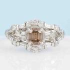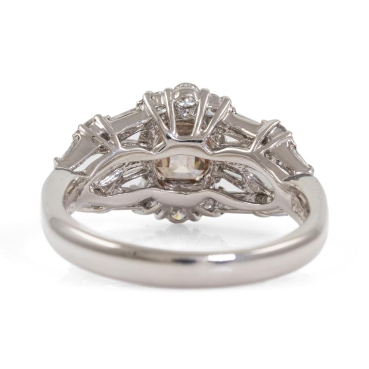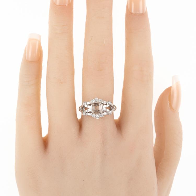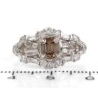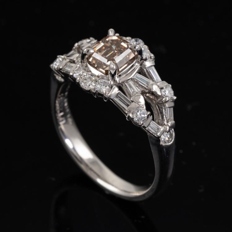 Diamond dress ring with centre emerald cut natural Champagne Diamond of 1.10ct (Estimated grading: Champagne VS2) and round & baguette cut natural Diamonds totalling 0.68ct (Estimated grading: G-H SI). Platinum 900. Ring size L 3/4. Band width: 2.8mm - 3.0mm. Weight: 6.8g. With Valuation Certificate #418618. (Pre-owned)
