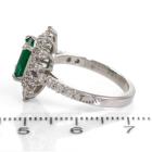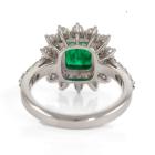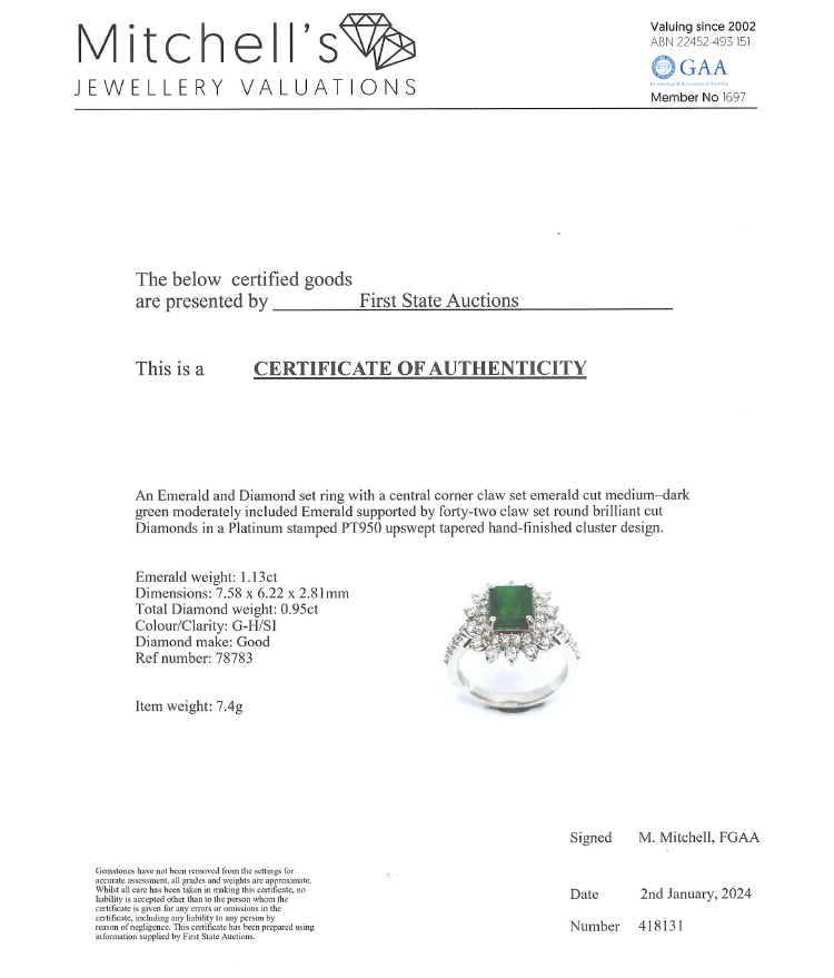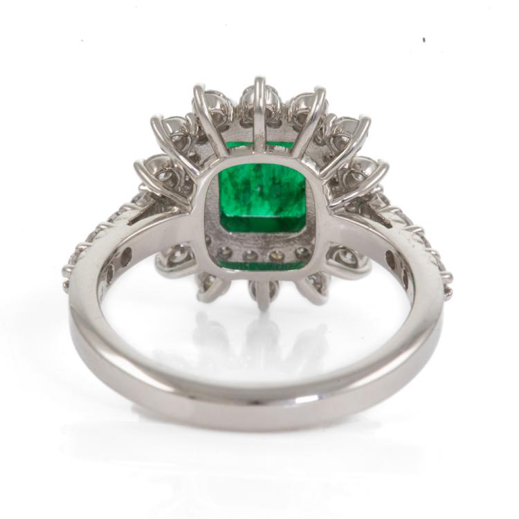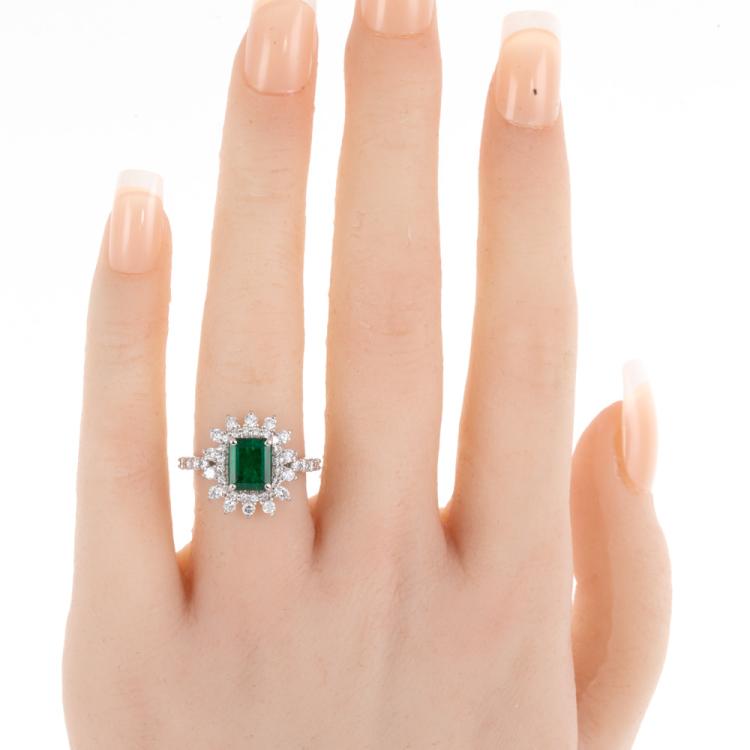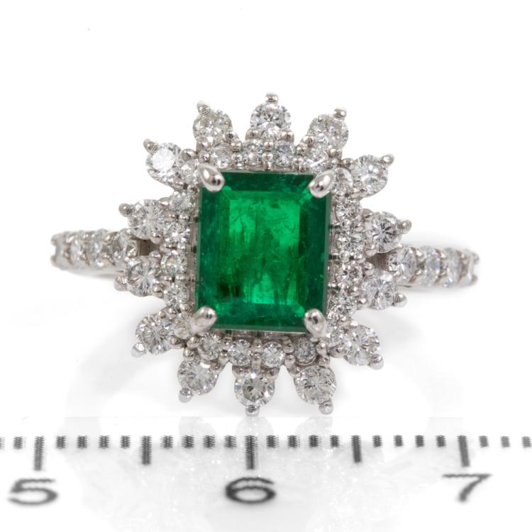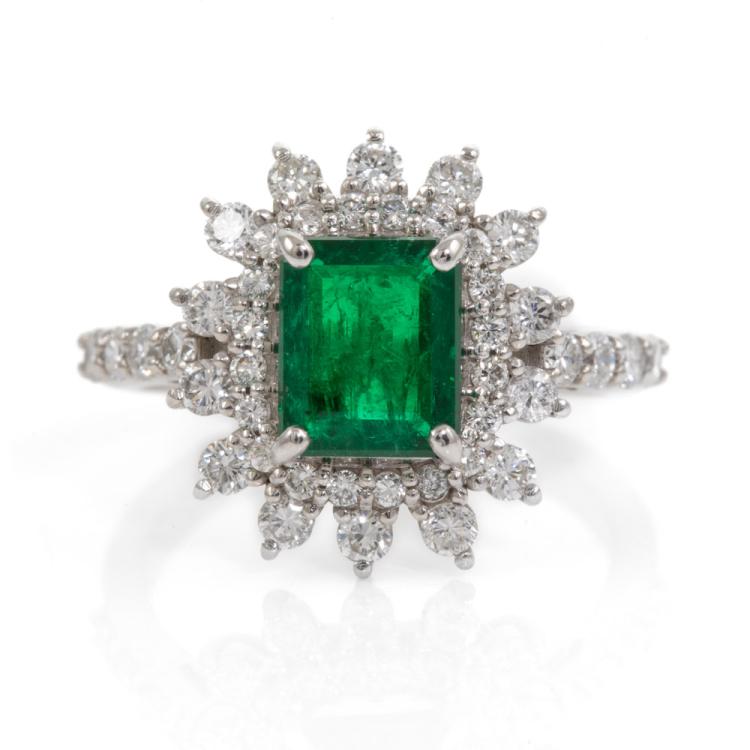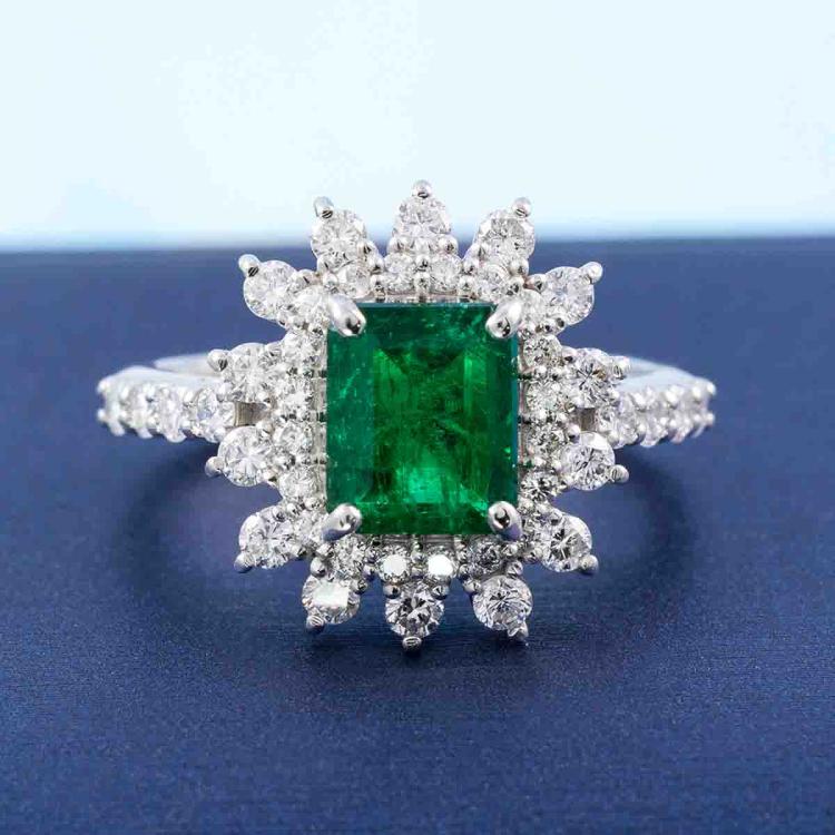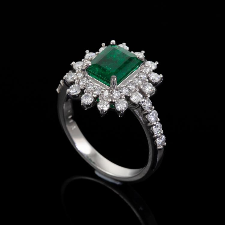 Emerald and Diamond ring with emerald cut Natural Emerald of 1.13ct and round Natural Diamonds totalling 0.95cts (Estimated grading: G-H SI). Platinum-950. Ring size L. Band width: 2.5mm. Weight: 7.4g. With Certificate #418131. (Pre-owned)