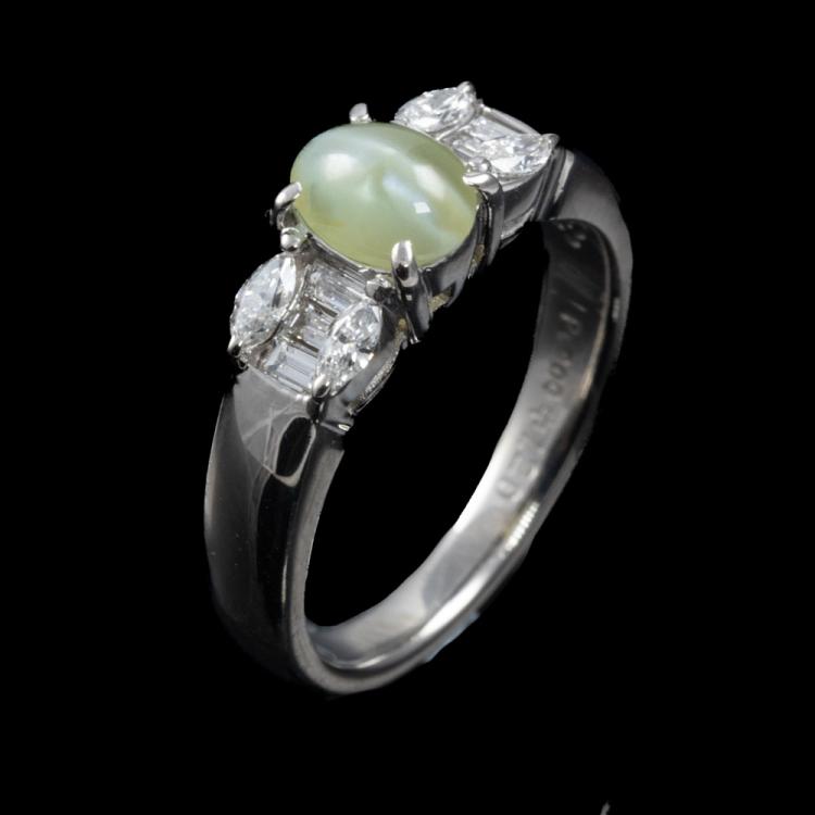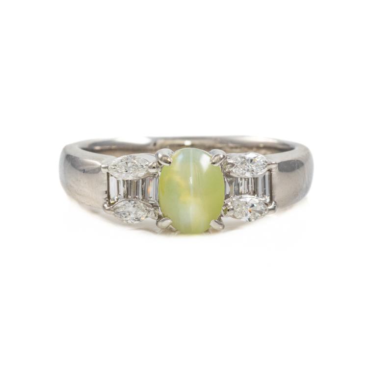 Chrysoberyl and Diamond ring with natural Chrysoberyl Cat's Eye of 1.20ct and natural round and marquise cut Diamonds totalling 0.36cts (Estimated grading: G-H SI). Platinum 900. Ring size L. Band width: 2.75mm - 4.0mm. Weight: 5.6g. (Pre-owned)