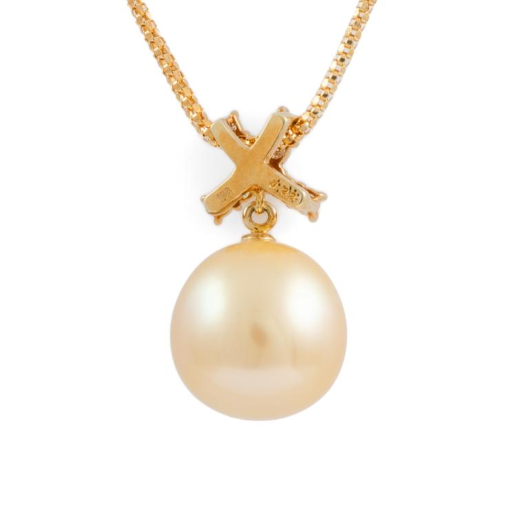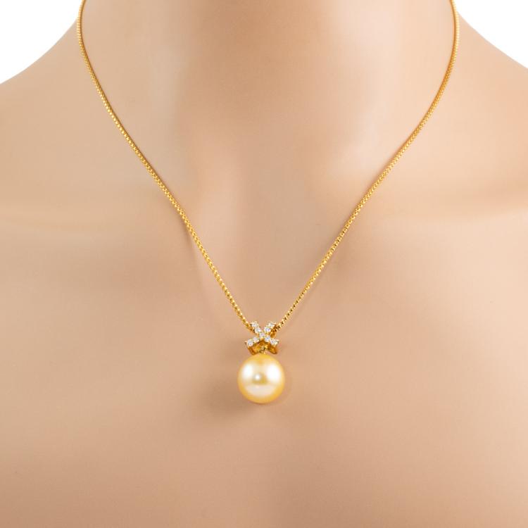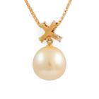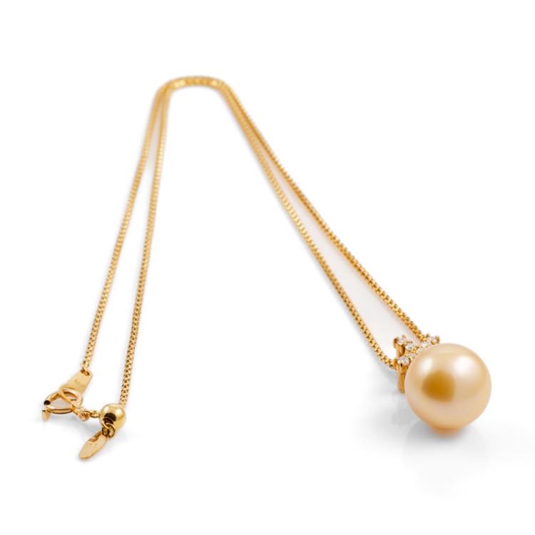 Pearl and Diamond pendant with Golden South Sea Pearl of 12.6mm and round natural Diamonds totalling 0.22cts. 18ct yellow gold with 45cm 18ct yellow gold chain. Weight: 7.2g. (Pre-owned)