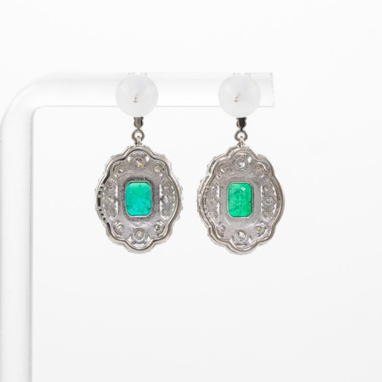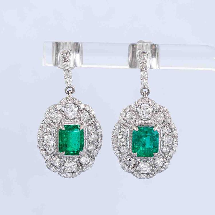 Emerald and Diamond drop earrings with emerald cut natural Emeralds totalling 1.38ct and round natural Diamonds totalling 1.10ct (Estimated grading: G-H SI). Platinum with 18ct white gold backs. Weight: 6.3g. With Certificate #418828. (Pre-owned)