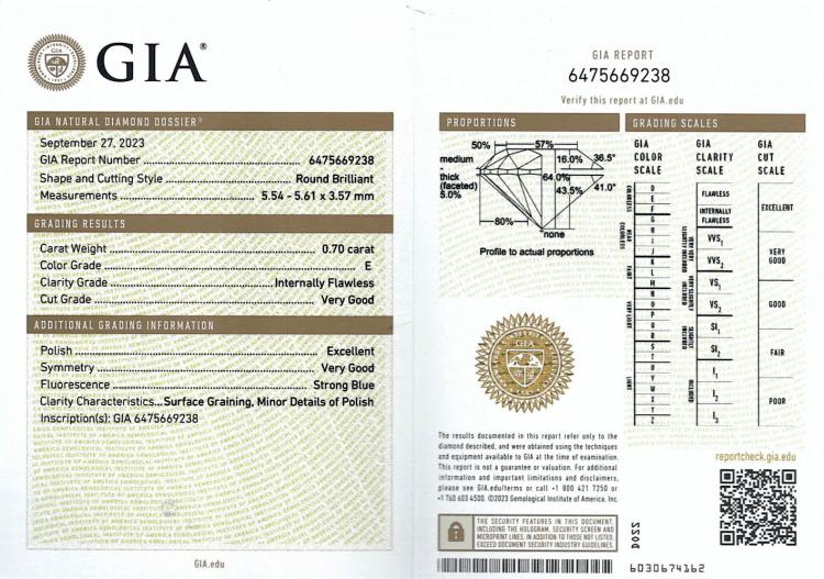 Diamond stud earrings with 2 round brilliant cut Natural Diamonds totalling 1.40cts (both with GIA Summary Reports graded as E Internally Flawless #7471400371, 6475669238). 18ct white gold. Weight: 1.6g. (New)