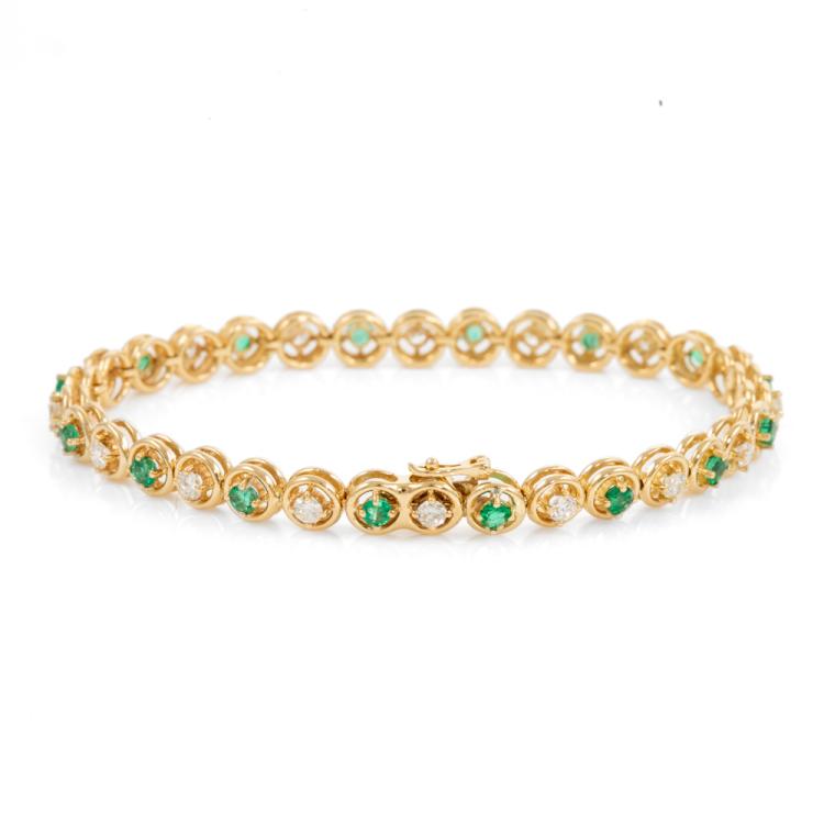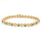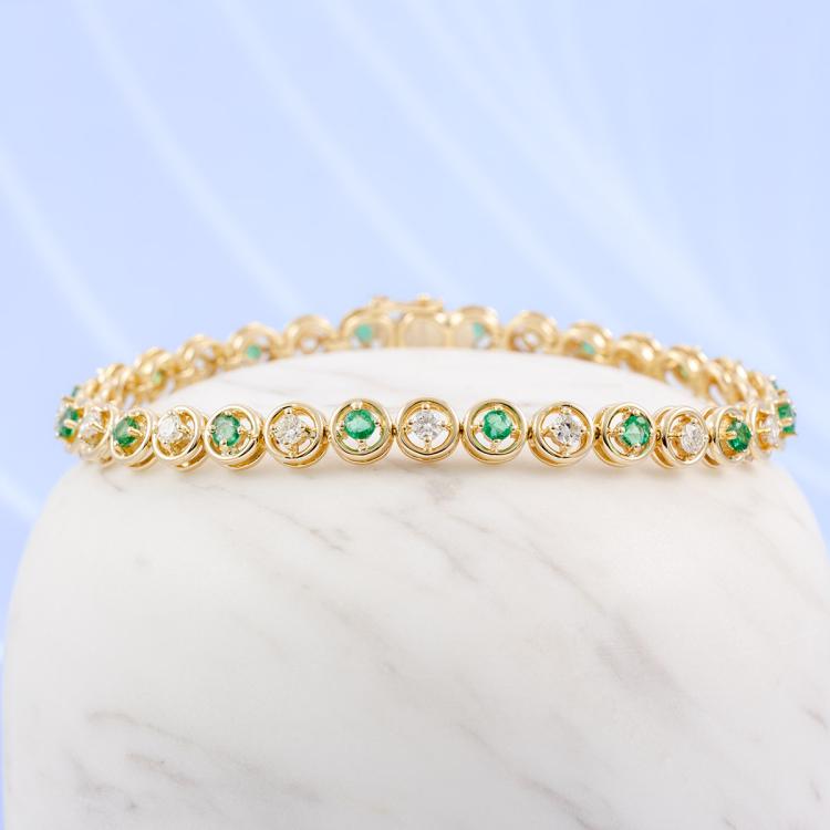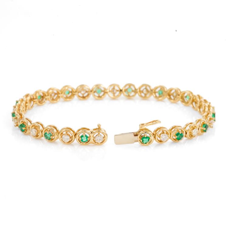 Emerald and Diamond bracelet with round Natural Emerald totalling 1.40cts (Note - 1 Emeralds next to clasp with chip) and round Natural Diamonds totalling 1.20cts (Estimated grading: I-J SI). 18ct yellow gold. Length: 17.5cm. Weight: 13.1g. With Certificate #418349. (Pre-owned)