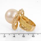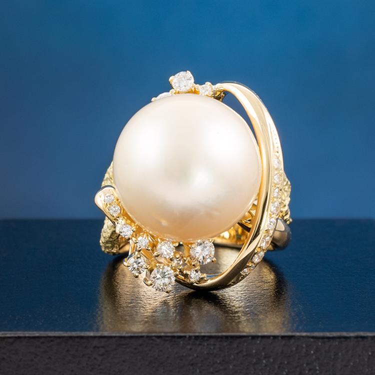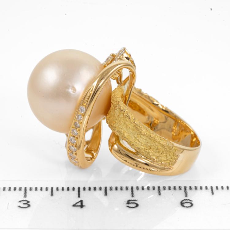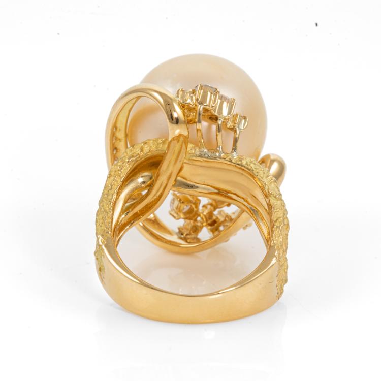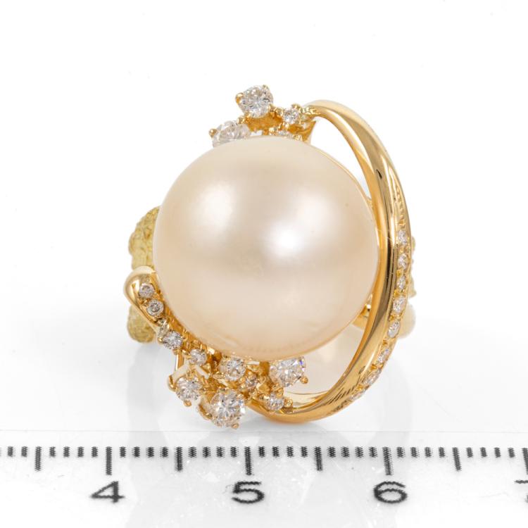 Pearl and Diamond ring with light champagne South Sea Pearl of 16.2mm and round Natural Diamonds totalling 0.62cts (Estimated grading: G-H SI). 18ct yellow gold. Ring size M1/2. Band width: 4.4mm x 7mm. Weight: 18.8g. With Certificate #418434. (Pre-owned)