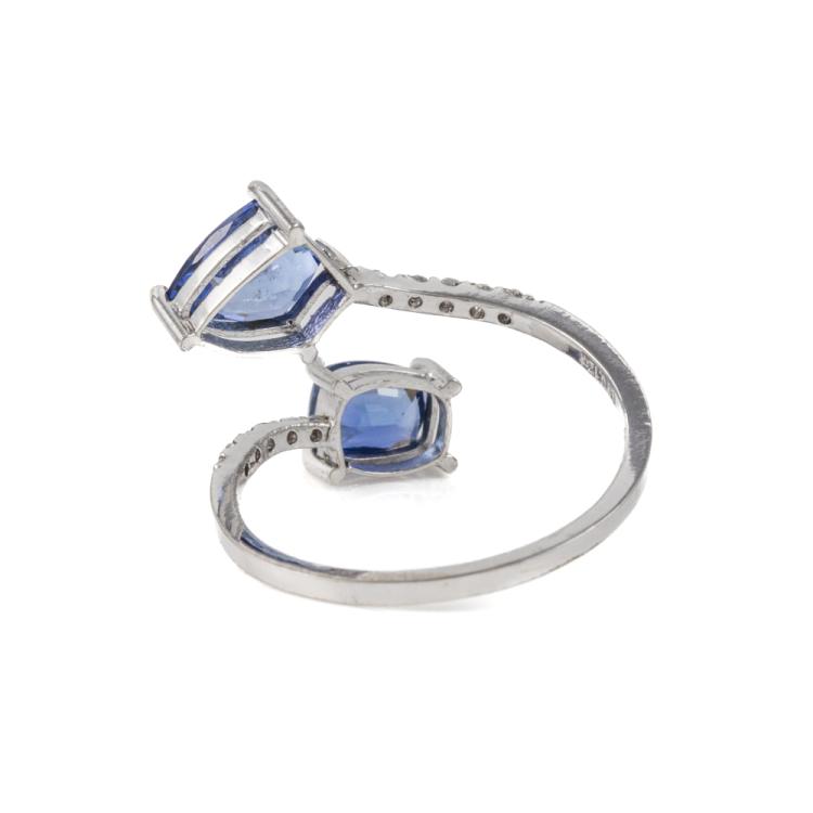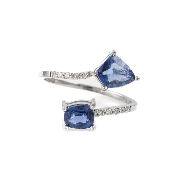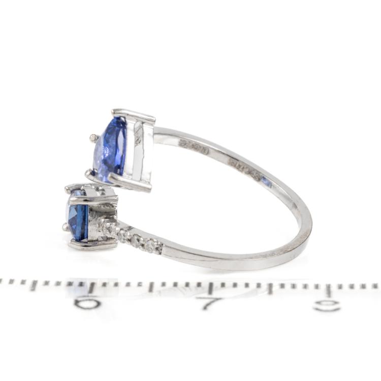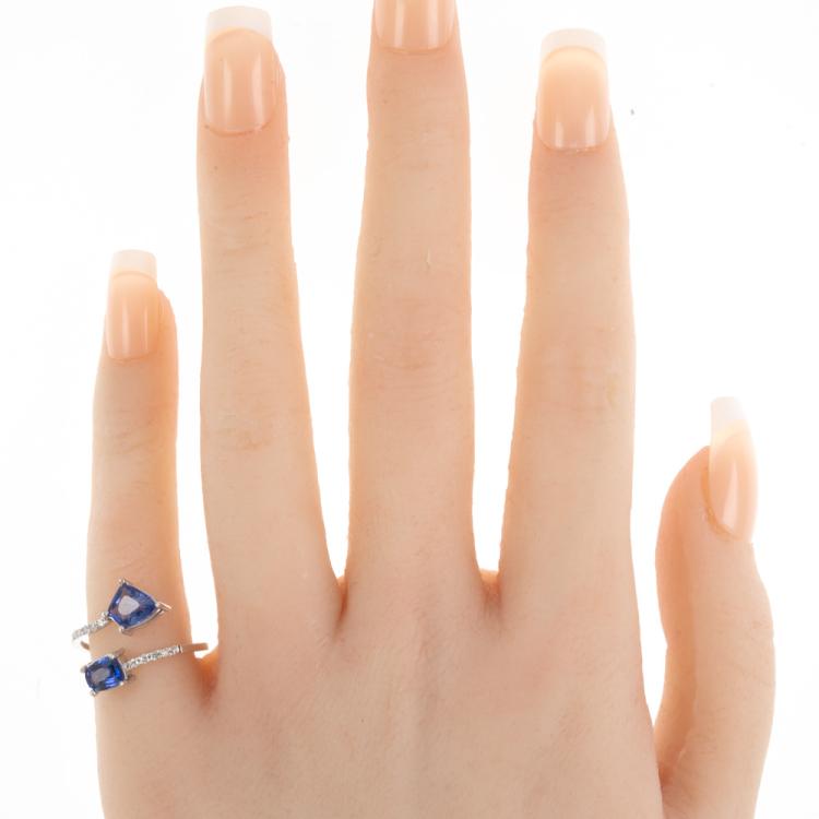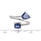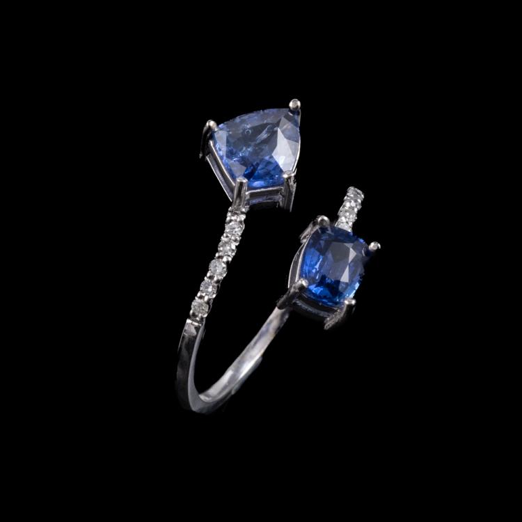 Sapphire and Diamond open ring with fancy cut blue unheated Ceylon Natural Sapphires totalling 1.71cts and round Natural Diamonds totalling 0.12cts. 14ct white gold. Ring size L. Band width: 1.1mm. Weight: 1.6g. With GGTL Report #206175. (As new)