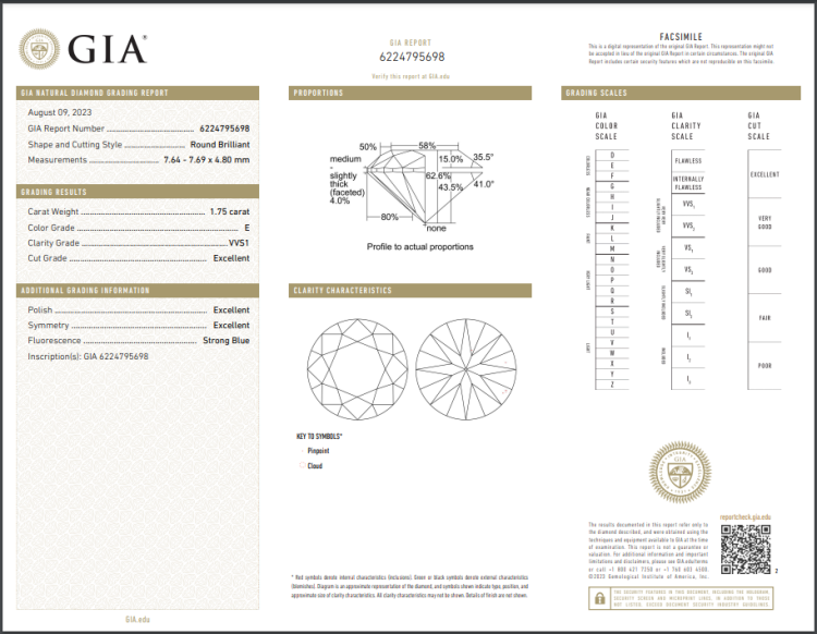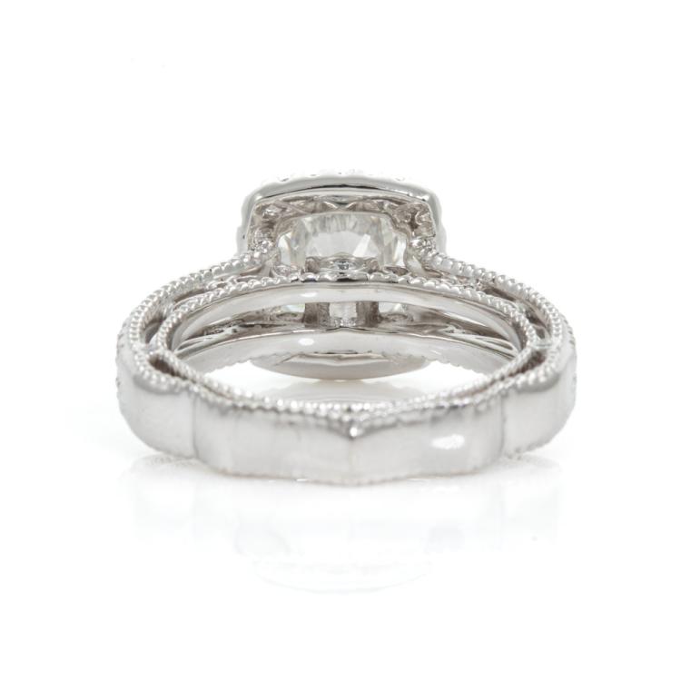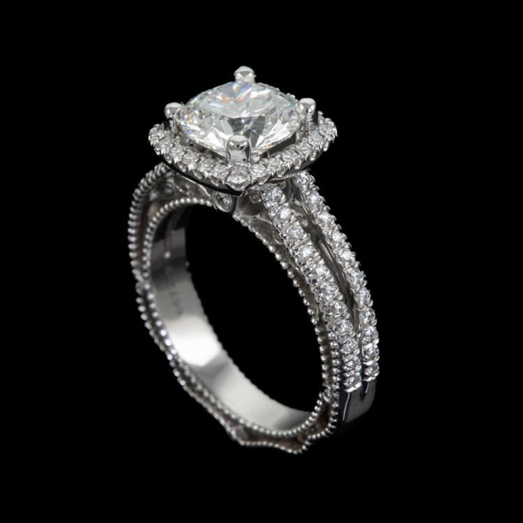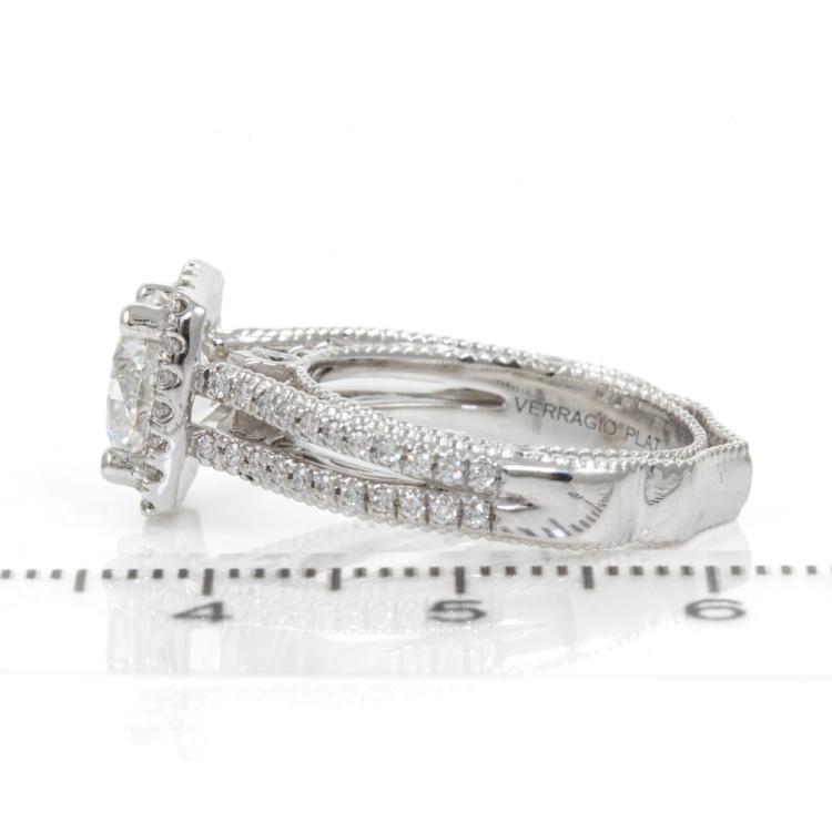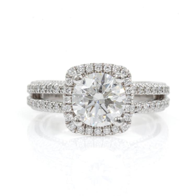 Diamond halo ring with centre round brilliant cut Natural Diamond of 1.75ct (with GIA Report graded as E VVS1 #6224795698) and surrounding round Natural Diamonds totalling approximately 0.34cts (Estimated grading: F-G VS). Platinum (stamped PLAT, XRF tested 95.59%). Engraved "Verragio". Ring size J½ - ring resizing is not recommended. Band width: 3.5mm. Weight: 8.2g. With Verragio box. (Pre-owned)