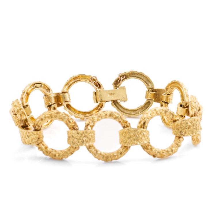 18ct yellow gold ring design bracelet. Weight: 40.4g. Length: 19cm. Width: 1.8cm. (Pre-owned)