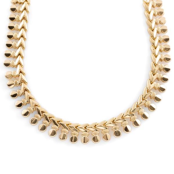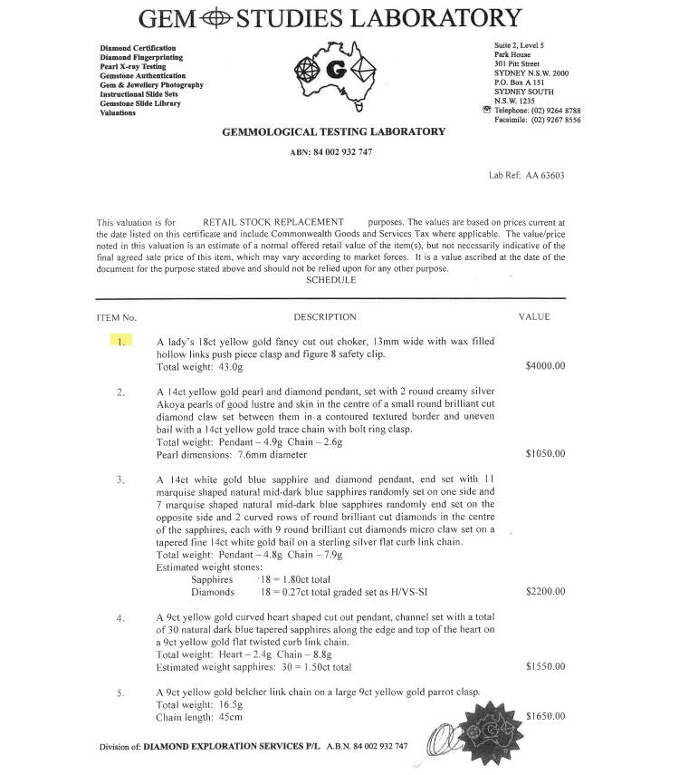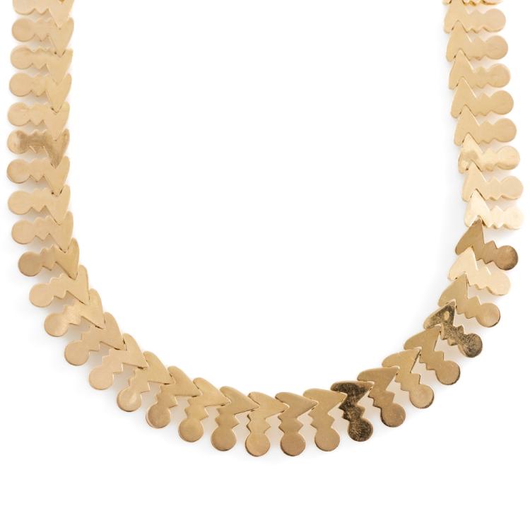 Gold Choker with hollow fancy links. 18ct yellow gold. Length: 44cm. Width: 1.3cm. Weight: 43.0g. With copy of GSL Valuation #AA 63603, Item 1. (Pre-owned)^