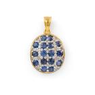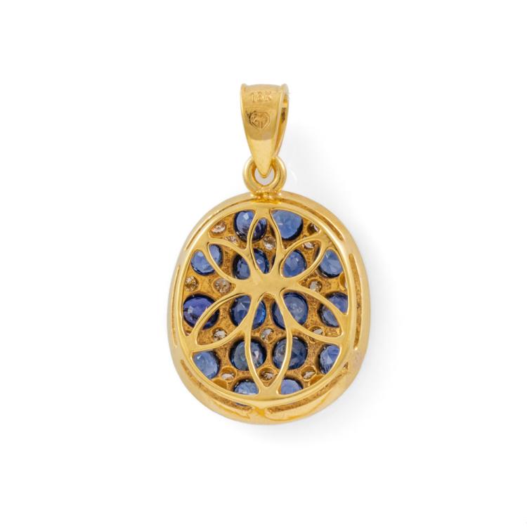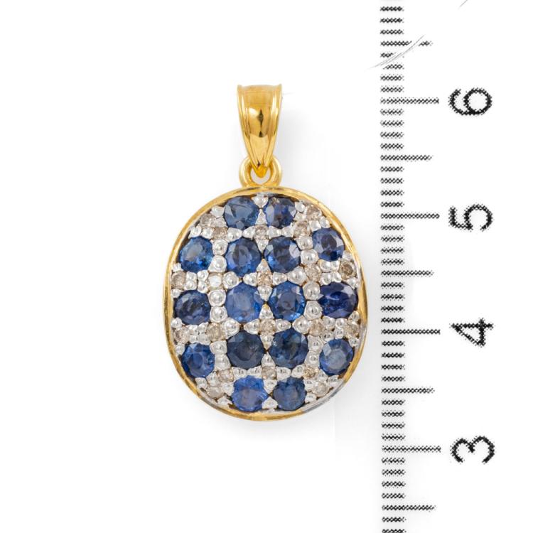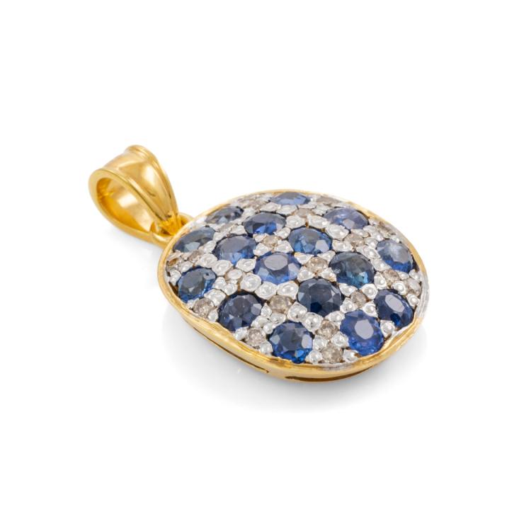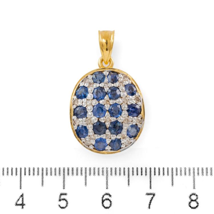 Sapphire and Diamond pendant with round natural blue Sapphires totalling approximately 1.90ct and round natural Champagne Diamonds totalling approximately 0.20ct. 18ct yellow and white gold. No chain provided. Weight: 4.5g. (Pre-owned)