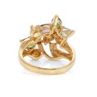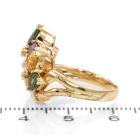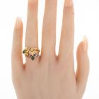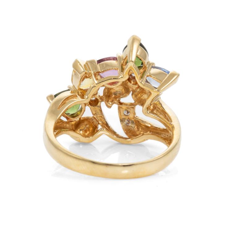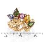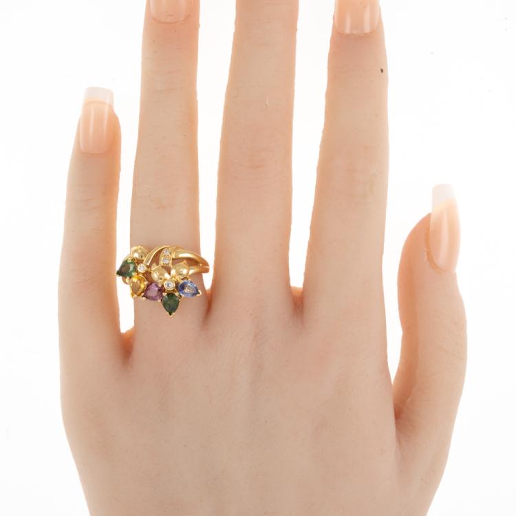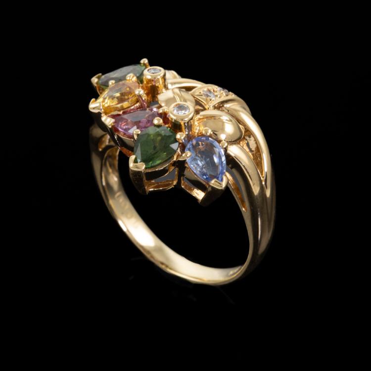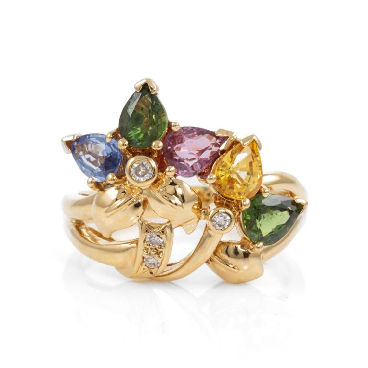 Sapphire and Diamond ring with pear shape natural multi-coloured Sapphire totalling 1.94cts and natural Diamonds totalling 0.06cts. 18ct yellow gold. Ring size K1/2. Band width: 2.45mm - 4.00mm. Weight: 6.0g. (Pre-owned)