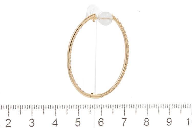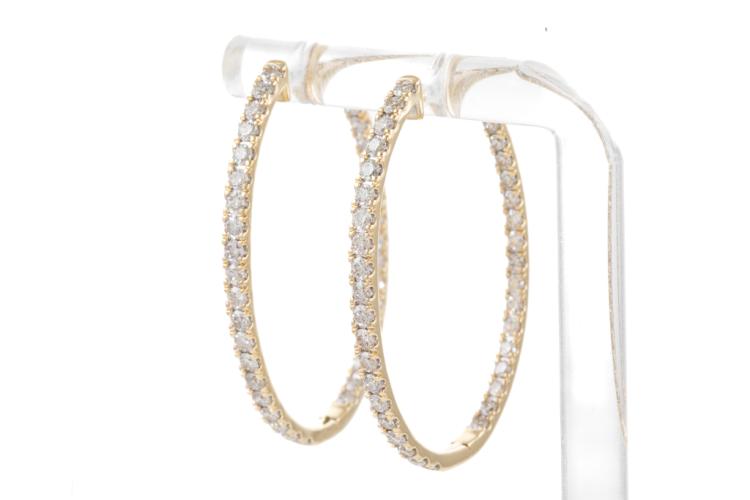 Diamond hoop earrings with 74 round Natural Diamonds totalling 1.98cts (Estimated grading: H SI). Back of the hoop has the Diamonds set inside the hoop. 14ct yellow gold. Width: 25.0mm. Length: 35.0mm. Weight: 6.4g. (New).