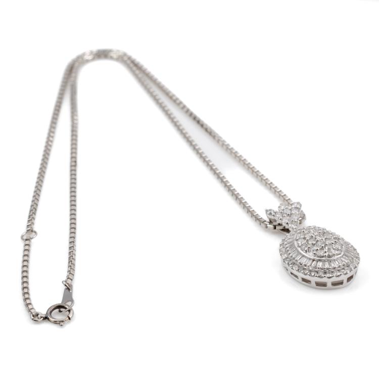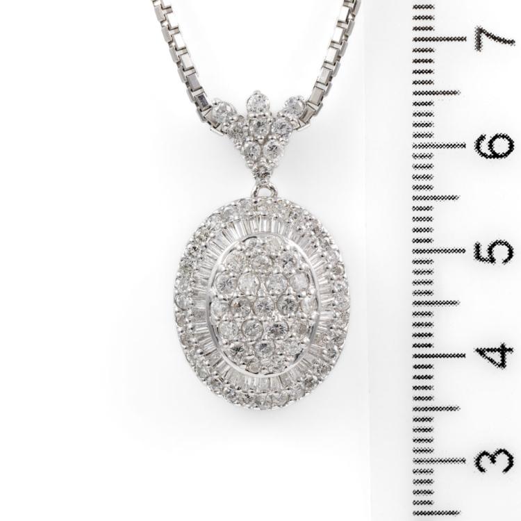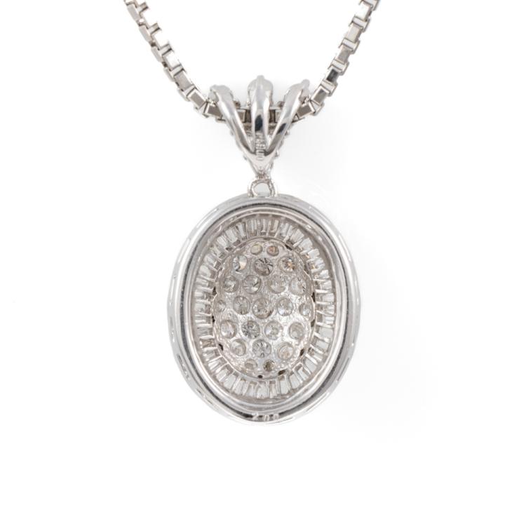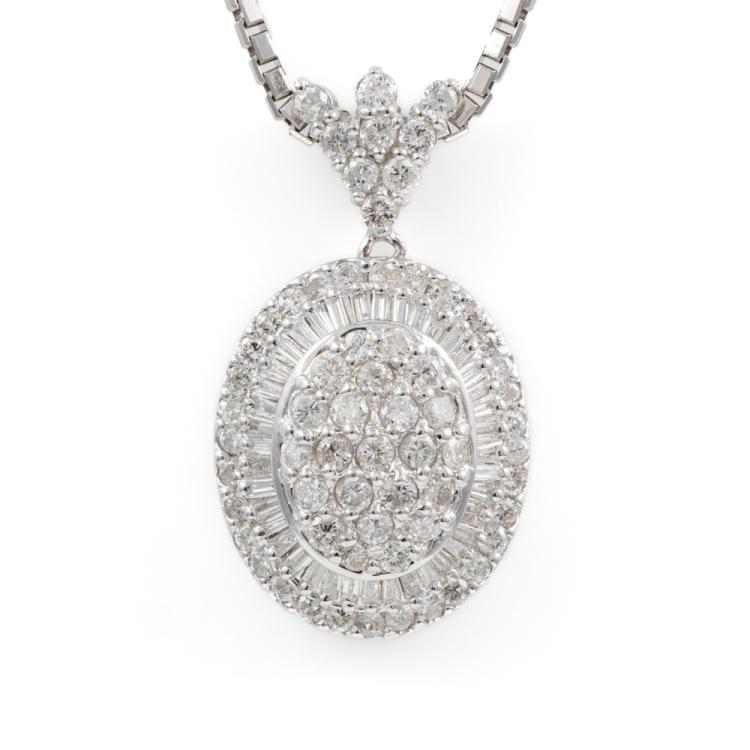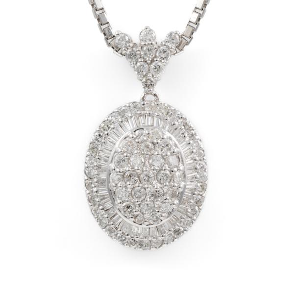 Diamond pendant with baguette & round Natural Diamonds totalling 2.00cts (Estimated grading: F-G SI). Platinum 900 with 45cm platinum 850 chain. Weight: 18.4g. (Pre-owned)