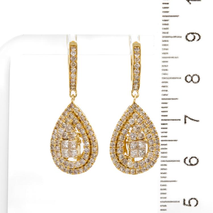 Diamond drop earrings with round & princess cut natural Diamonds totalling 2.00cts (Estimated grading: K-L SI-P1). 18ct yellow gold. Weight: 4.6g. (Pre-owned)