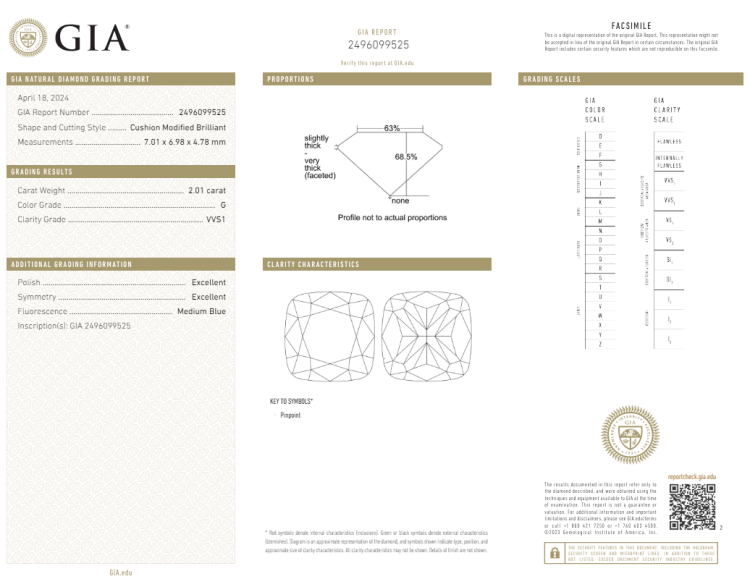 A loose cushion cut Natural Diamond of 2.01ct (with GIA report graded as G VVS1 #2496099525). (New)