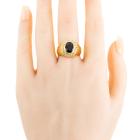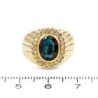 Mens ring with oval dark greenish blue Natural Sapphire of 2.05ct and round Natural Diamonds totalling 0.34cts (Estimated grading: G-H SI-P1. 18ct yellow gold. Ring size P1/2. Band width: 4mm - 5.9mm. Note, ring band with a minor crack. Weight: 7.1g. (Pre-owned)
