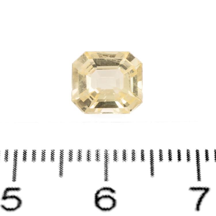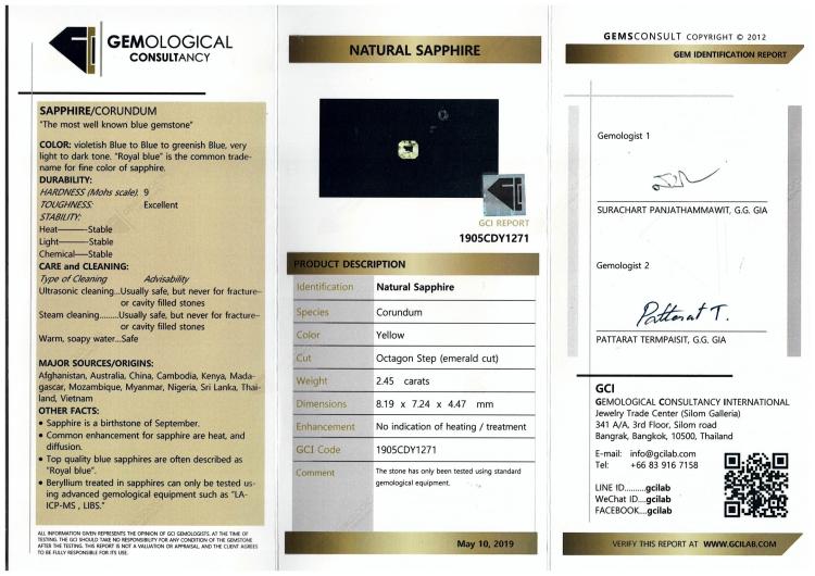 A loose emerald cut unheated yellow Natural Sapphire of 2.45ct. With CGI report #1905CDY1271 and valuation dated 16/05/22. (Pre-owned)