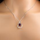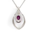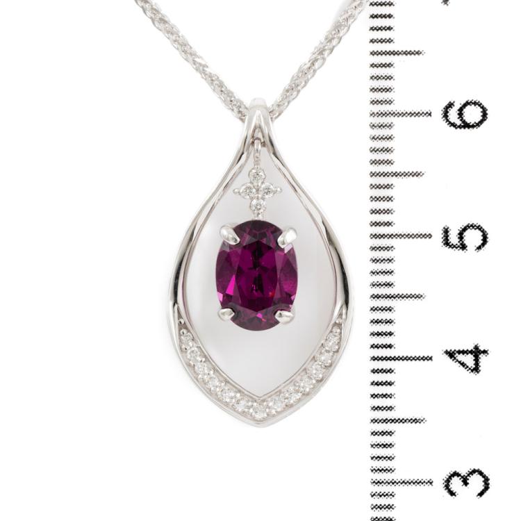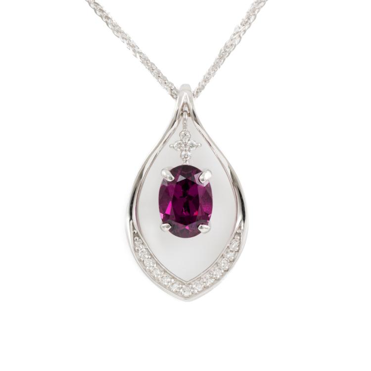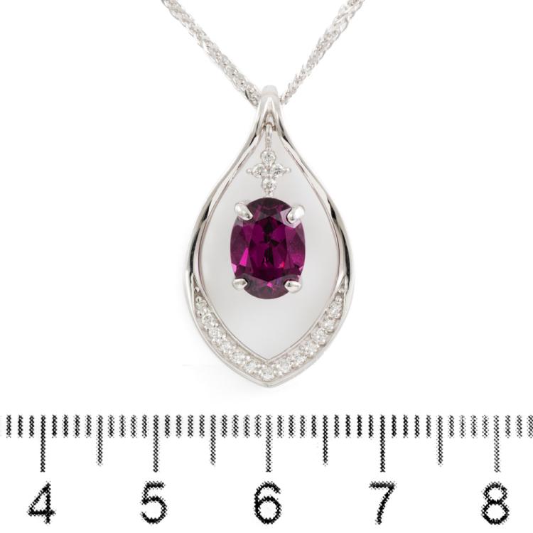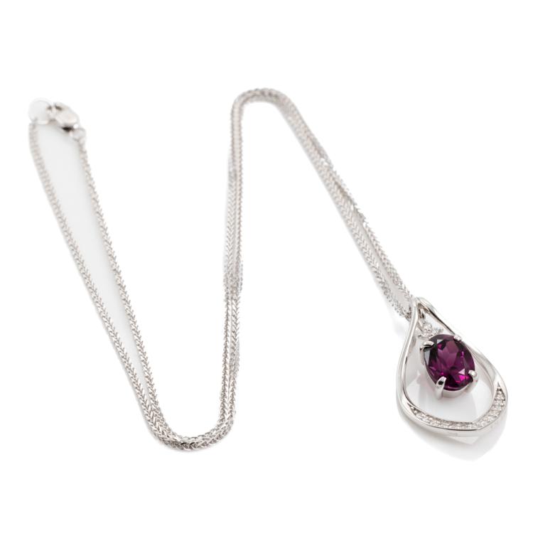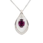 Garnet and Diamond pendant with oval shape purple Natural Rhodolite Garnet of 2.50ct and round Natural Diamonds totalling 0.13cts. 18ct white gold with 45.5cm 18ct white gold chain. Weight: 6.2g. (Pre-owned)
