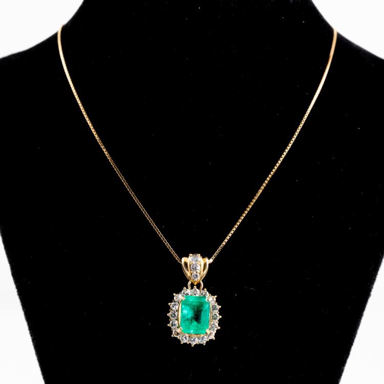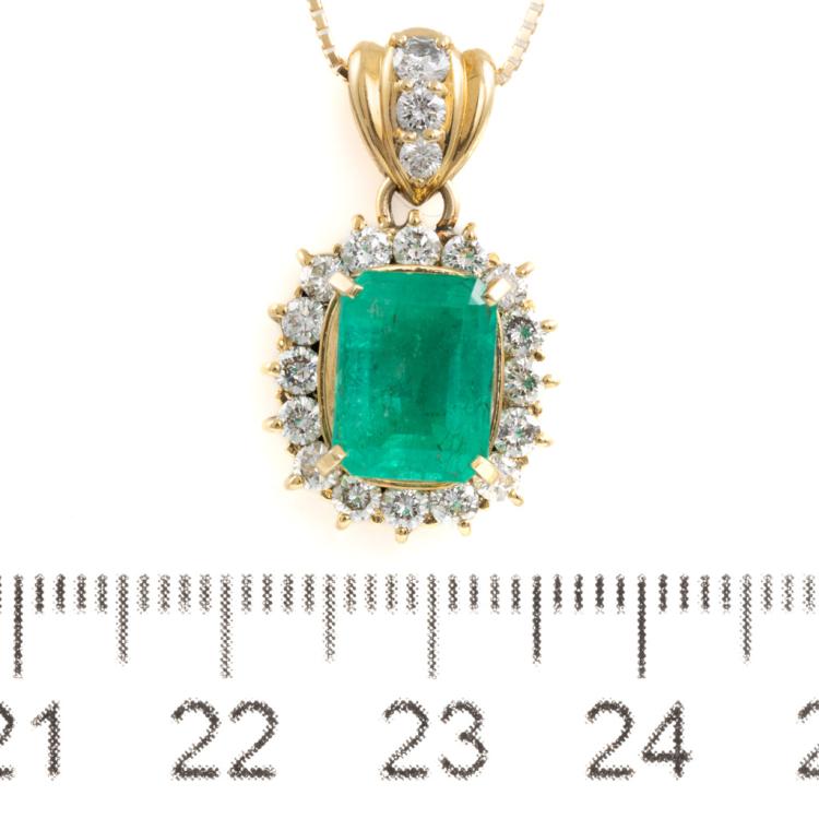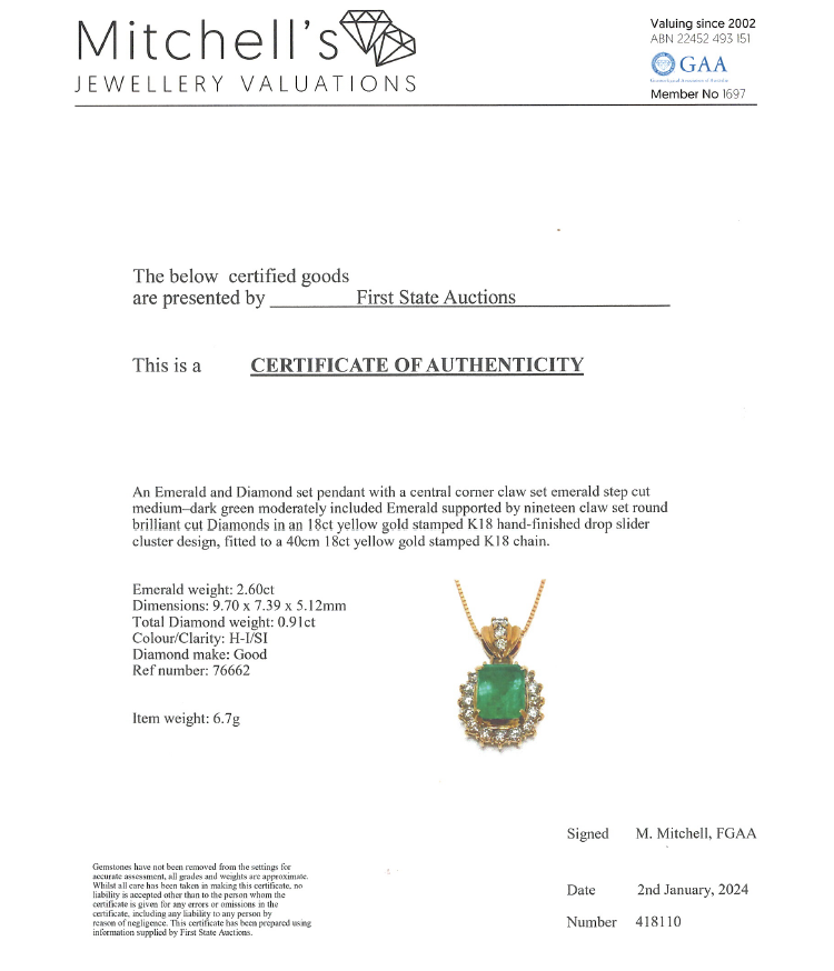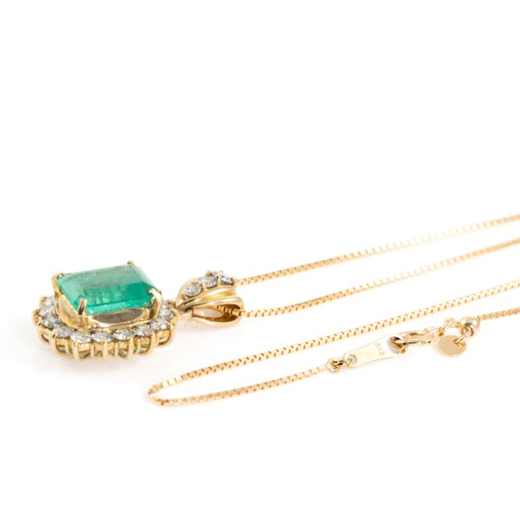 Emerald and Diamond pendant with emerald cut Natural Emerald of 2.60ct and round Natural Diamonds totalling 0.91cts (Estimated grading: H-I SI). 18ct yellow gold with 40cm 14ct yellow gold chain. Weight: 6.7g. With Certificate #418110. (Pre-owned)