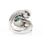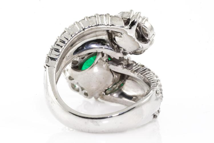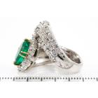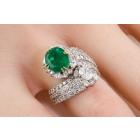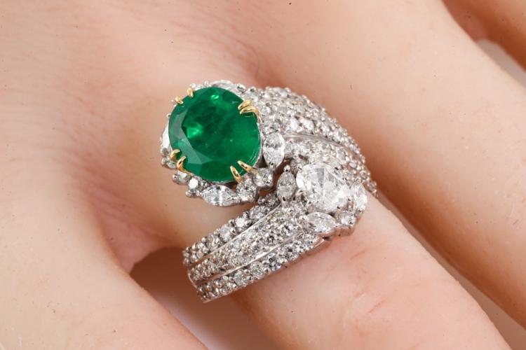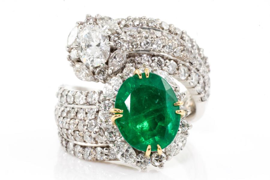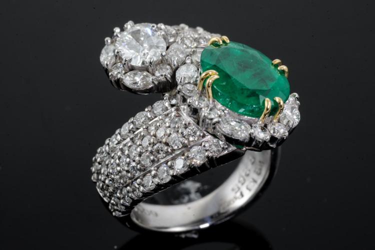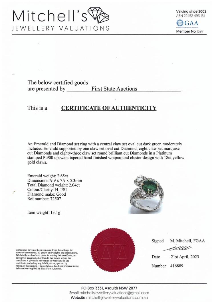 Emerald and Diamond ring with oval shape Natural Emerald of 2.65ct and oval shape, marquise cut & round Natural Diamonds totalling 2.04cts (Estimated grading: H-I SI). 18ct yellow gold and platinum. Ring size H1/2 - ring resizing is not recommended. Weight: 13.1g. With certificate #416889. (Pre-owned)