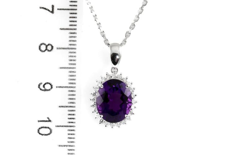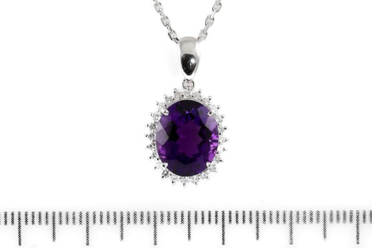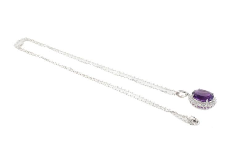 Amethyst and Diamond pendant with oval shape natural Amethyst of 3.30ct and round natural Diamonds totalling 0.28cts. Platinum-900 with 40cm 18ct white gold chain. Weight: 6.0g. (Pre-owned)