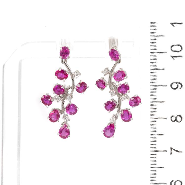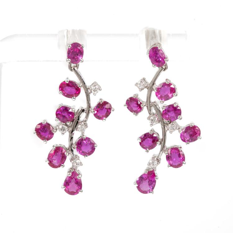 Sapphire and Diamond earrings with oval & pear shape Pink Natural Sapphires totalling 3.64cts and round Natural Diamonds totalling 0.12cts. 18ct white gold with 18ct white gold & silicon backs. Weight: 5.3g. (Pre-owned)