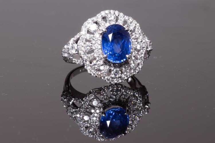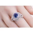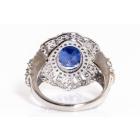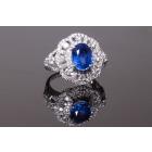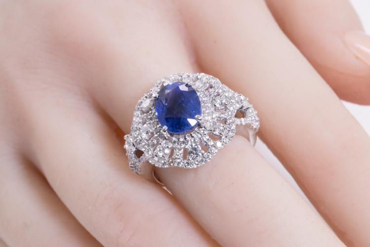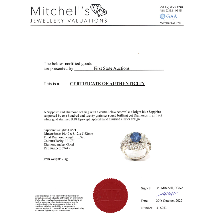 Sapphire and Diamond ring with oval shape blue Natural Sapphire of 4.45ct and round Natural Diamond totalling 1.89cts (Estimated grading: H-I SI). 18ct white gold. Ring size P - recommended downsize with clip. Weight: 7.3g. With certificate #416253. (Pre-owned)