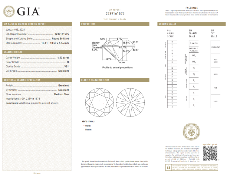 A loose round brilliant cut Natural Diamond of 4.50ct (with GIA report graded as D VS1 #2239161575). (New)