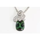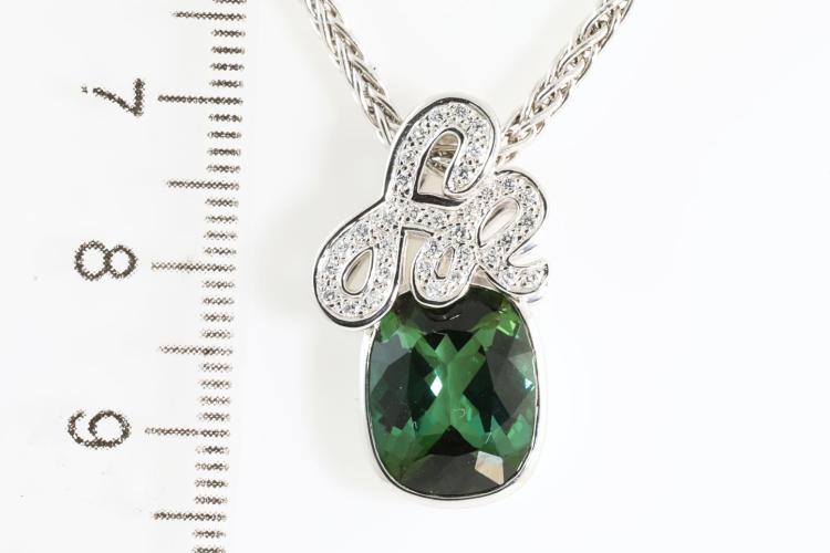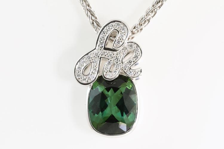 Tourmaline and Diamond pendant with an Oval Green Tourmaline of 5.33ct and Diamonds totalling 0.17cts. 18ct white gold with 18ct white gold 50cm chain. Weight: 12.4g (Pre-owned)