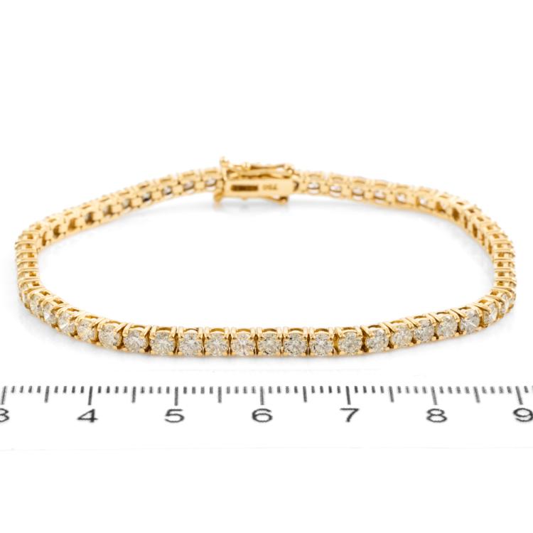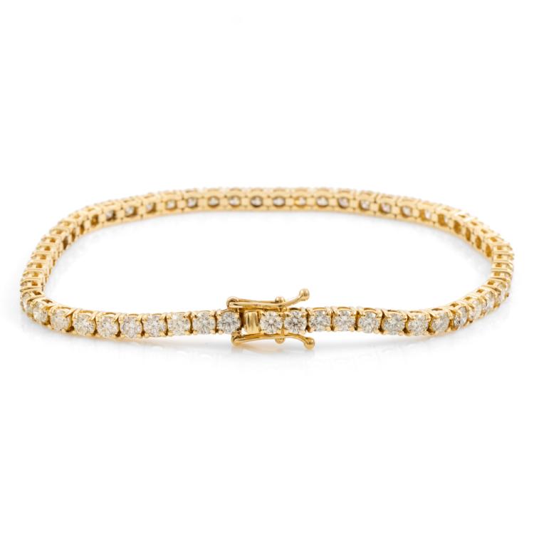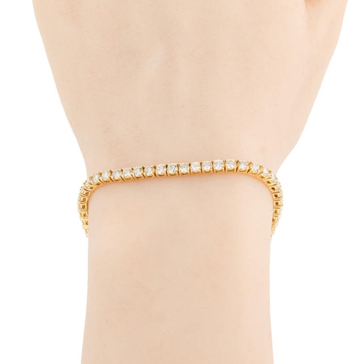 Diamond tennis bracelet with 57 round brilliant cut Natural Diamonds totalling 5.95ct. (Estimated grading: I-J SI). 18ct yellow gold. Length: 18cm. Weight: 10.4g. With Valuation Certificate #417979. (New)